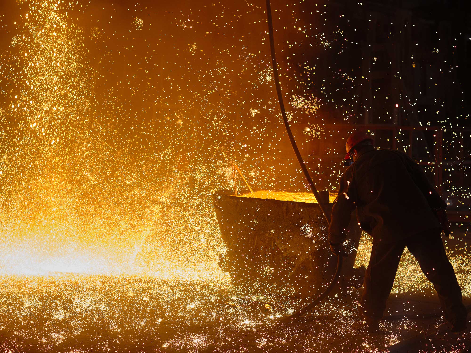 Modern steelmaking involves several production stages. Most commonly, iron ore is crushed and turned into sinter (a rough solid) or pellets. Separately, coal is baked and converted into coke. The ore and coke are then mixed with limestone and fed into a large blast furnace where a flow of extremely hot air is introduced from the bottom. Under high temperatures, the coke burns and the mixture produces liquid iron, known as pig iron or blast-furnace iron. The molten material then goes into an oxygen furnace, where it’s blasted with pure oxygen through a water-cooled lance, which forces off carbon to leave crude steel as a final product.