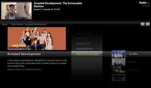 It helps a lot that the free Hulu Desktop app is beautifully designed in every way. It’s intended to be operated with a remote (either the little white Apple Remote or any Windows Media Center compatible one), and the interface is perfectly intuitive–browsing shows, scrubbing through an episode with a nifty pop-up still, seeing recommendations and even rating and queuing shows to your own Hulu account are all possible with a few button presses.