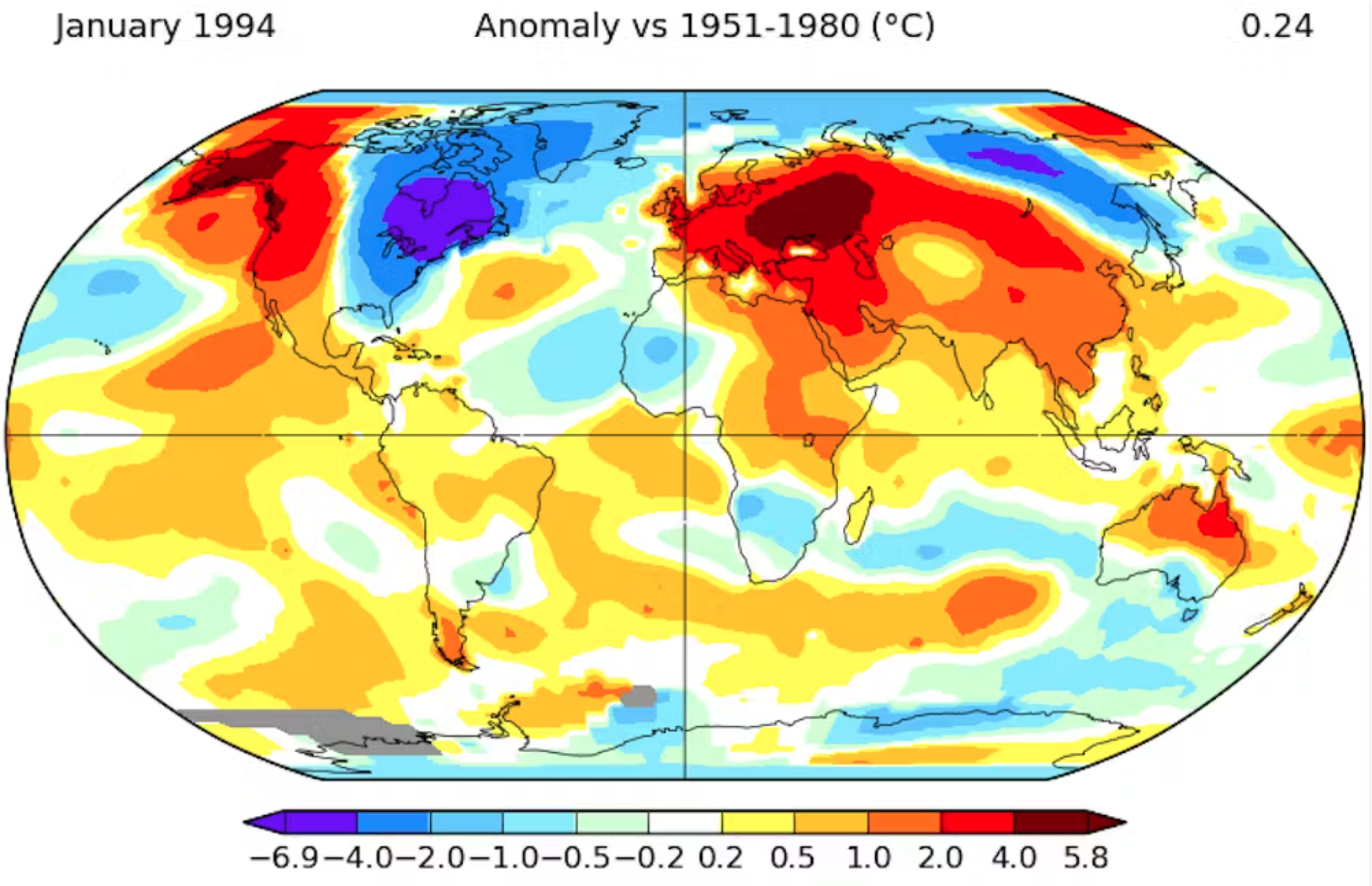 But if we compare January 1994 to the 1951-1980 baseline instead, that cold spot in the eastern U.S. isn’t quite as large or extreme.
