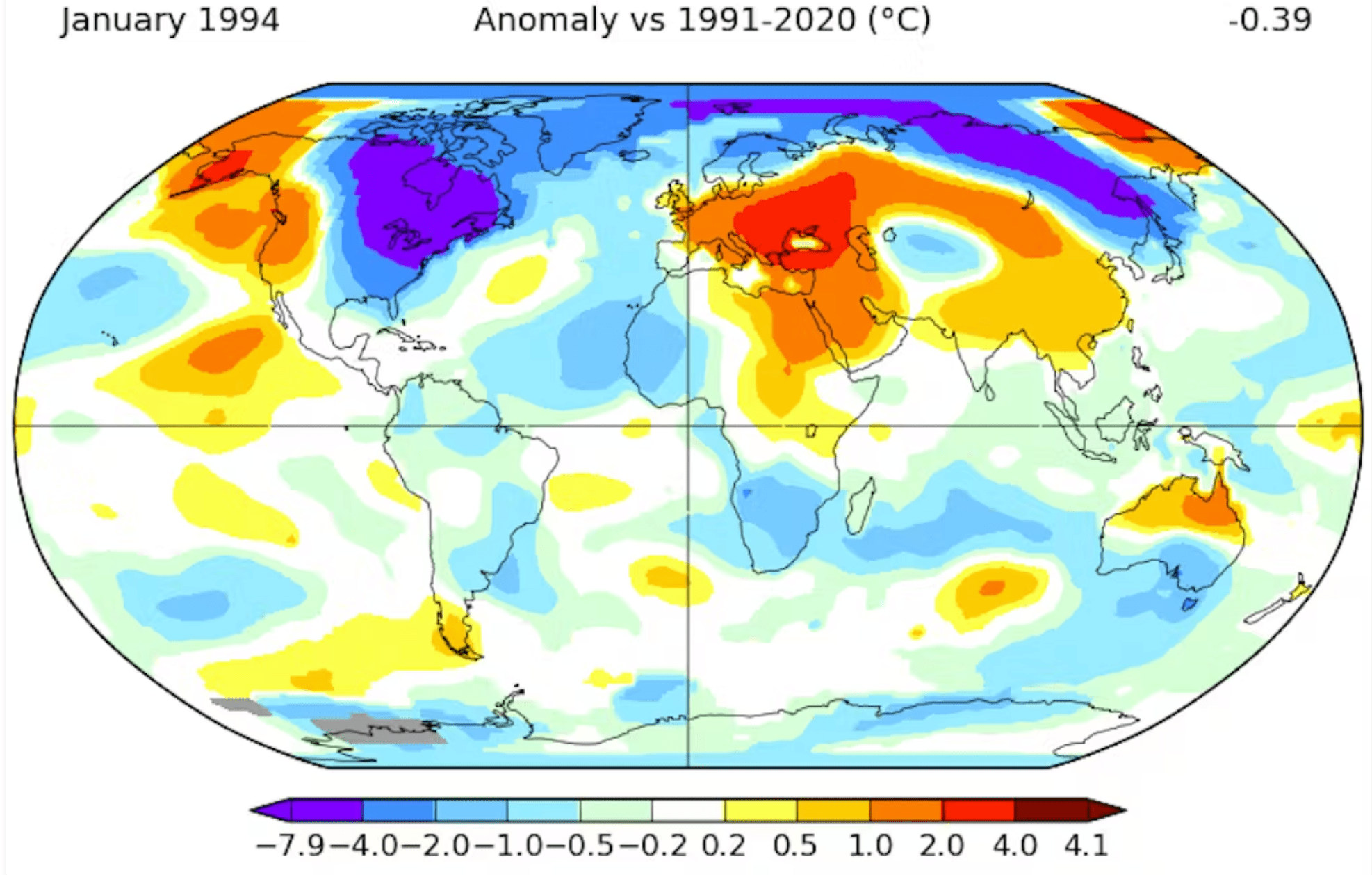 Where the temperatures in some parts of the country in January 1994 approached 14.2 F (7.9 C) colder than normal when compared to the 1991-2020 average, they only approached 12.4 F (6.9 C) colder than the 1951-1980 average.