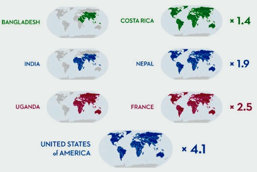 Assuming we were able to use all the land on the planet–with the exception of Antarctica– here’s how much of Earth(s) we would need if we all lived like people in Bangladesh (or India. Or France. Or, yes, the U.S):