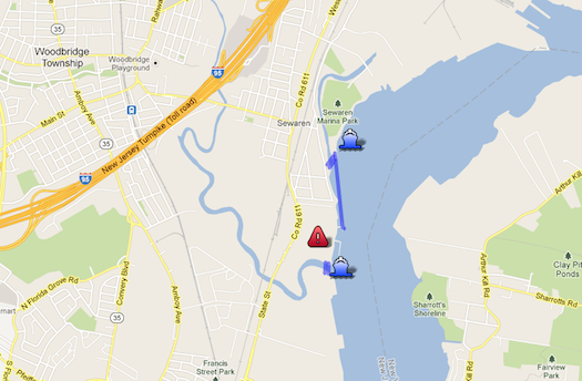 The oil came from two 3.15 million gallon-capacity tanks at the Motiva petroleum storage facility, in Sewaren, N.J., damaged during Hurricane Sandy. Each contained 336,000 gallons of oil prior to the storm. The site is located on the Arthur Kill, a 10-mile-long, 600-foot wide tidal strait dividing mainland New Jersey from Staten Island, N.Y.