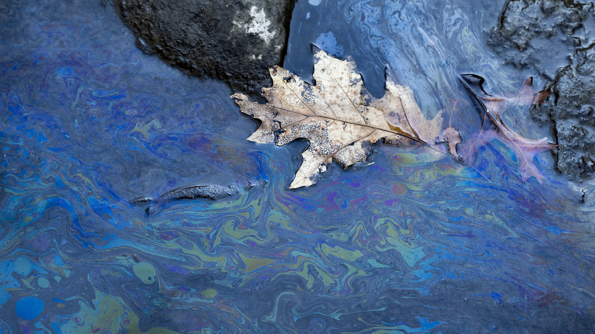 On a late August morning, Tsai asked me to stand on the freshly created edge of the pool, while he shook some dirt and rocks loose from the bank with a metal rod. As they tumbled into the water, an iridescent web spooled out across the water’s surface, emanating from the point Tsai had disturbed. He exclaimed into his respirator, declared the water as bad as he’d ever seen, and gestured for me to lean down and look closer. The simple fact of my body’s weight on the creek bank elicited a new burst of oily sheen, billowing into the still pool.
