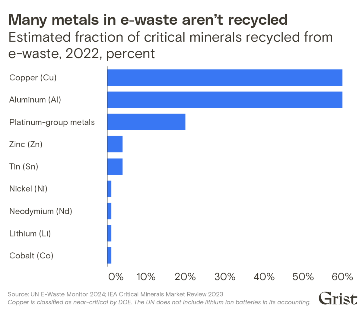 For other energy transition metals, recycling rates are far lower. Take the rare-earth element neodymium, which is used in the permanent magnets found in everything from iPhone speakers to electric vehicle motors to offshore wind turbine generators. Worldwide, Baldé and his colleagues estimated there were 7,248 metric tons of neodymium locked away in e-waste in 2022—roughly three-quarters of the 9,768 metric tons of neodymium the wind and EV sectors required that year, per the IEA. Yet less than 1 percent of all rare earths in e-waste are recycled due to the immaturity of the underlying recycling technologies, as well as the cost and logistical challenges of collecting rare earth-rich components from technology.