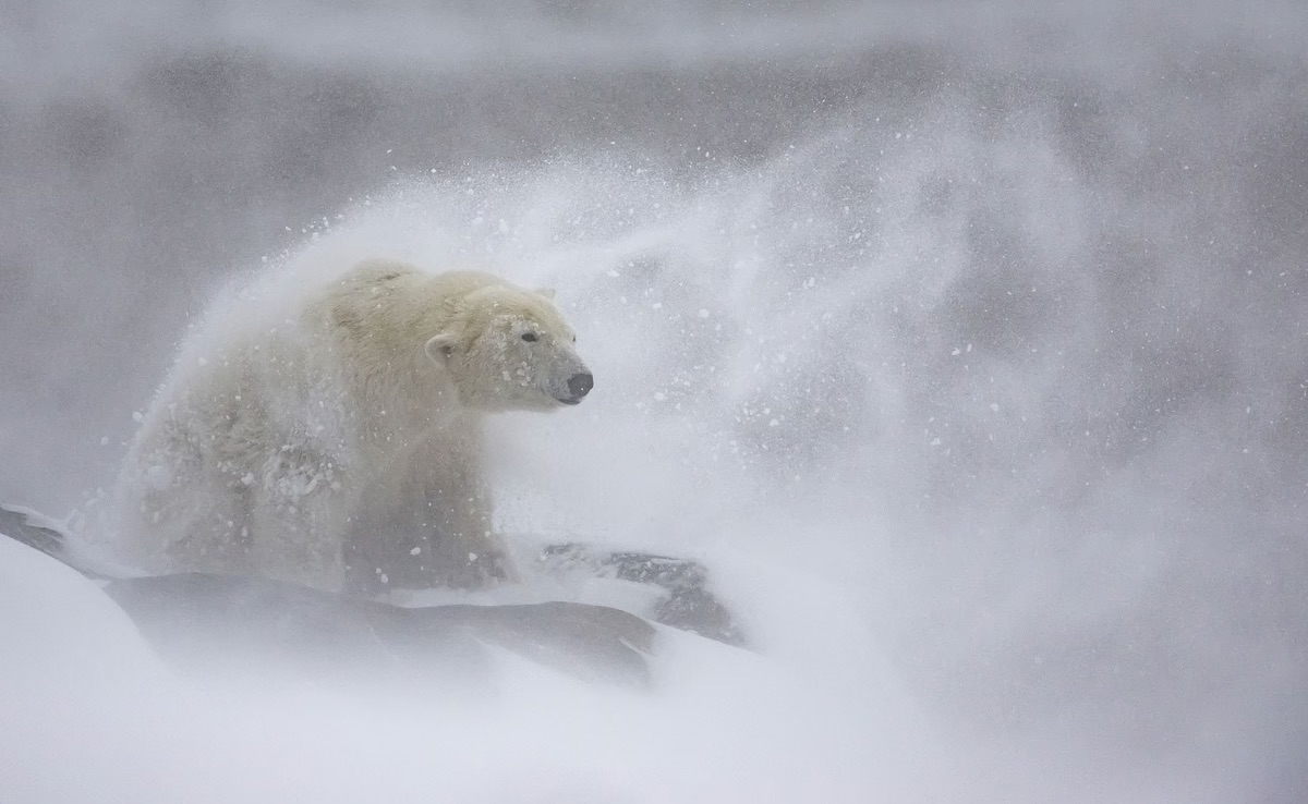 A polar bear sits seemingly unbothered by a heavy snowstorm pummeling down. Photographer Daniel Valverde Fernandez captured the moment (seen above) the bear gave a vigorous shake to send the powder flying into the swirling winds. The image earned runner-up honors in the Mammals category of the 2024 European Wildlife Photographer of the Year.