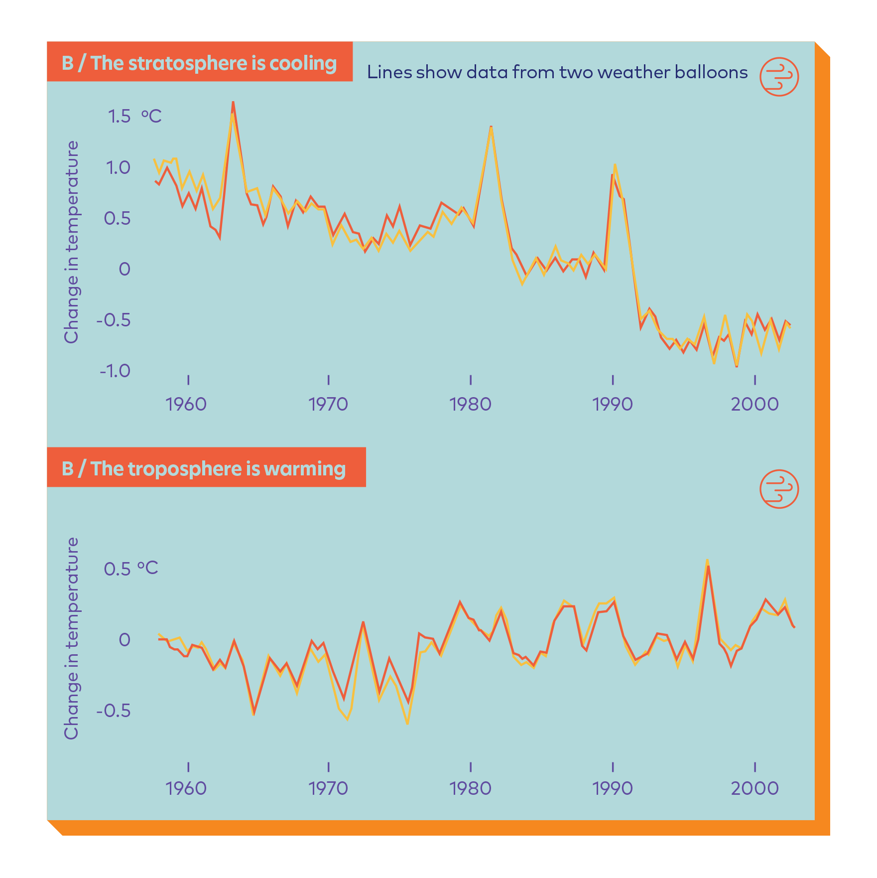 If, as some folks claim, increased solar activity is causing global warming, the entire atmosphere would be growing hotter. Instead, data reveals greenhouse gases are trapping heat in the troposphere (the portion closest to us), making it expand. Meanwhile, the stratosphere above it is cooling and shrinking. It’s lost a quarter mile since the 1980s and may retract another 0.6 miles by 2080, which could create stronger storms and disrupt satellite trajectories and GPS communications.