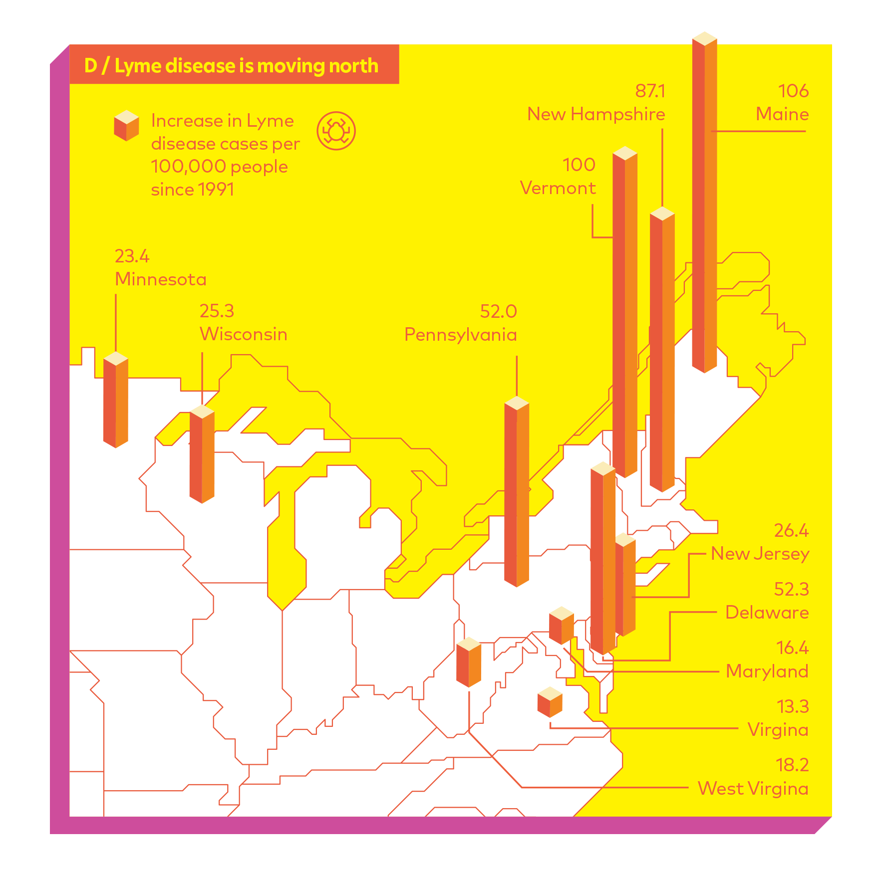 Warming is bringing deer ticks into areas that were until recently too cold for them, introducing Lyme disease to new regions. Infections in the US nearly doubled between 1991 and 2018, with potentially serious implications: If untreated, Lyme can cause joint, heart, and neurological disorders. As temperatures continue climbing and winters grow shorter, the little bloodsuckers will keep on spreading—they’ve already arrived in parts of Canada that were previously free of them.