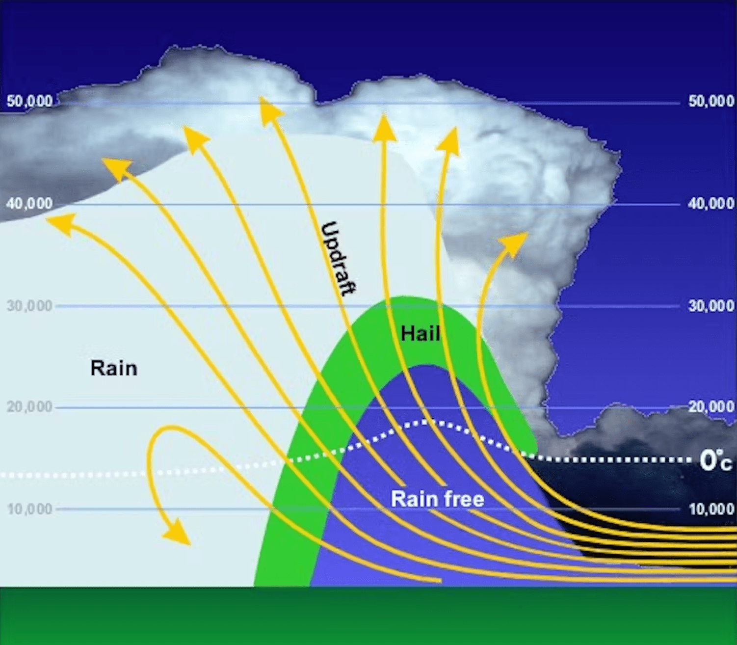 The path a hailstone takes through a thunderstorm cloud, and the time it spends collecting supercooled water, dictates how large it can grow.