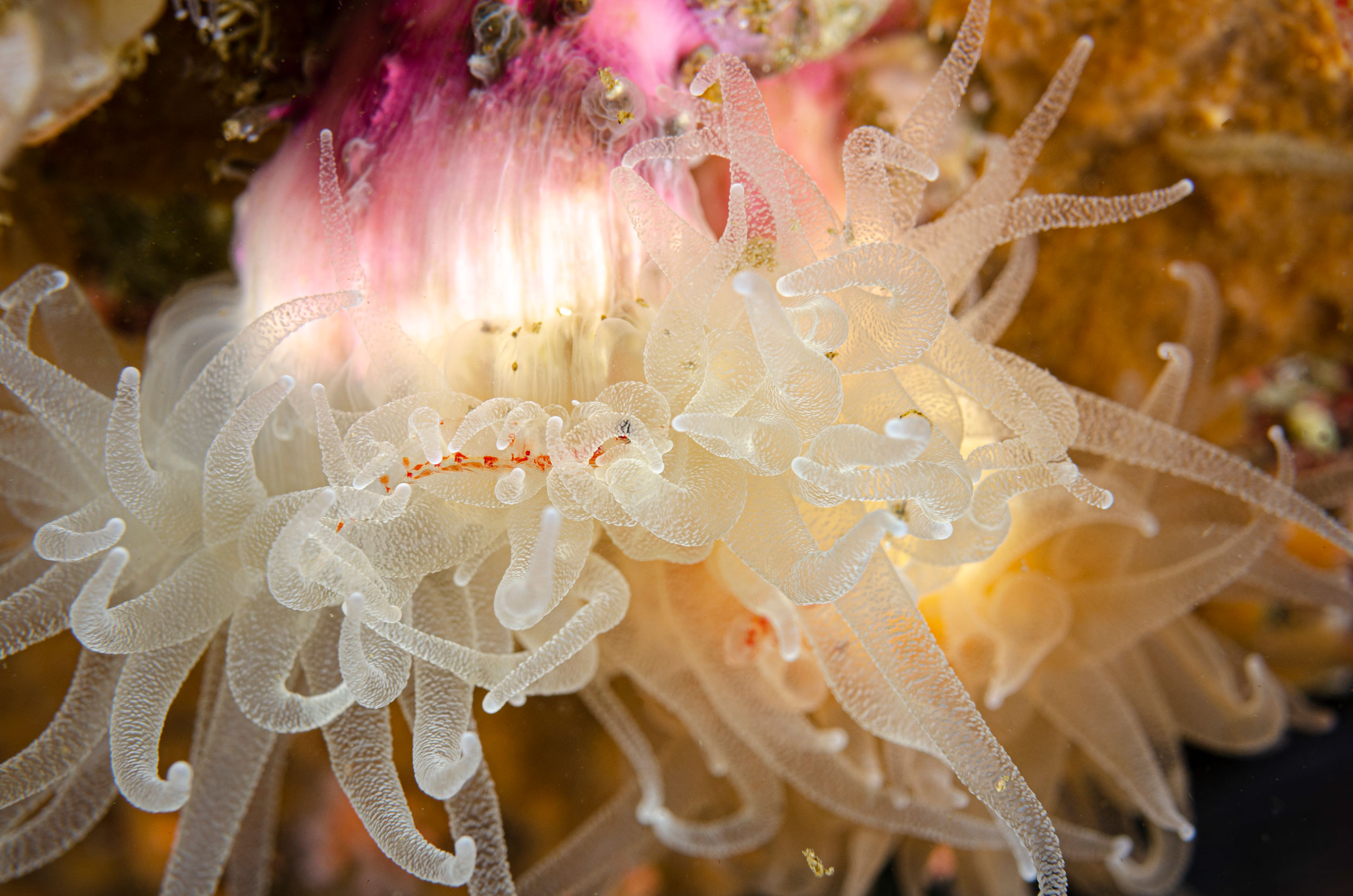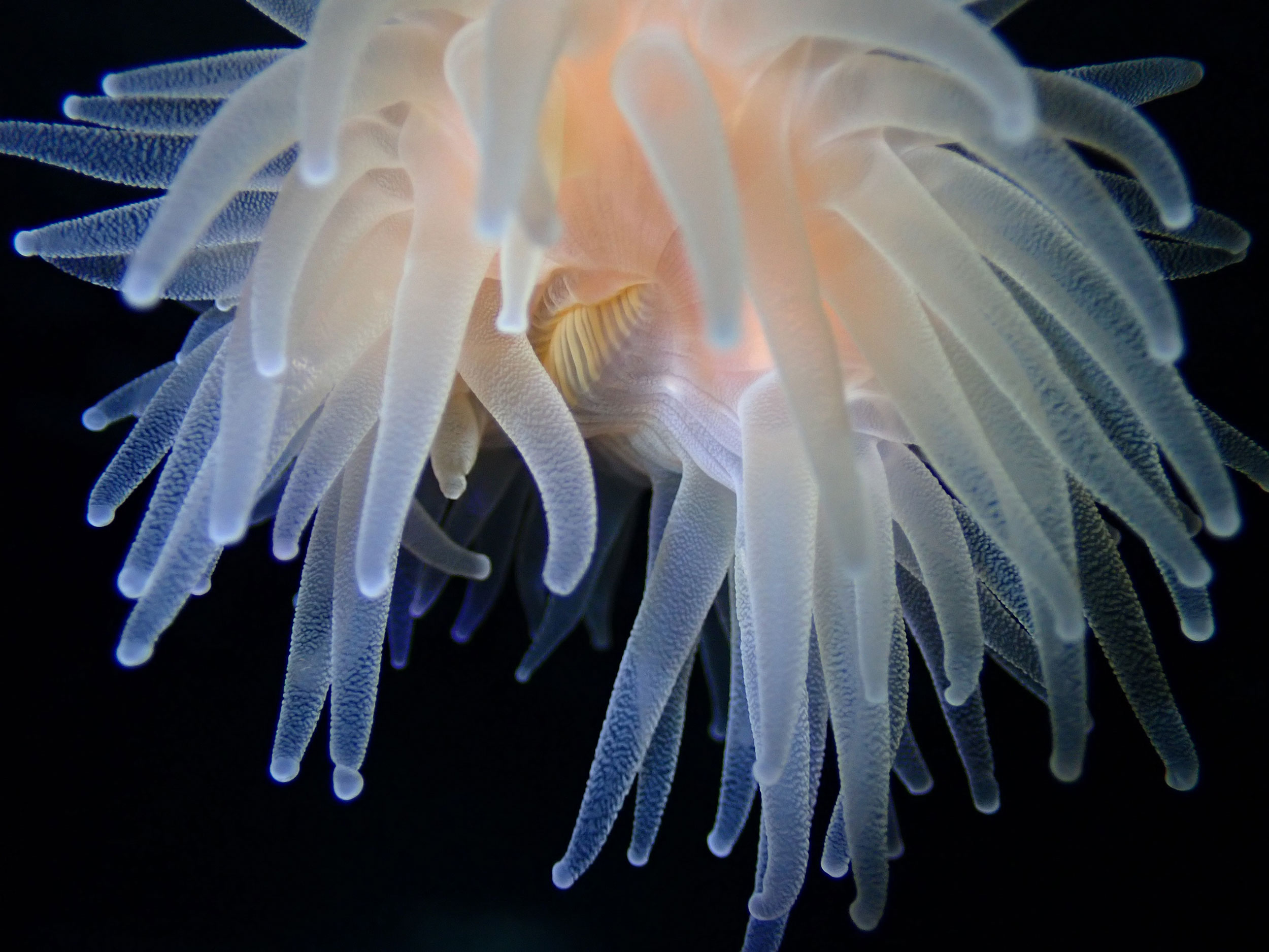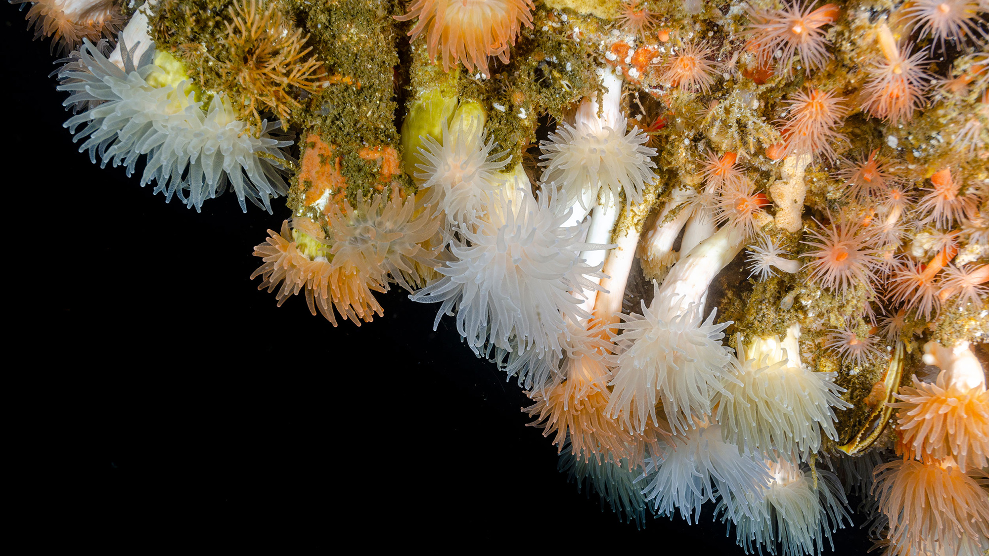 Which is why, when Waller learned that a pair of German biologists had found D. dianthus in relatively shallow Patagonian fjords, she raced to Chile. On the sheer cliff walls of the fjord, D. dianthus grows as a vertical marine animal forest—hundreds of thousands of individuals reaching out to dine on the plankton that rise to the surface every day and fall to the fjord’s bed every evening. While deep-sea D. dianthus grows short and stubby, in groups of two or three, and has a wide mouth, the fjord variety is long and slender, forming dense groves of individuals that reach into the water column to catch as much food as possible.