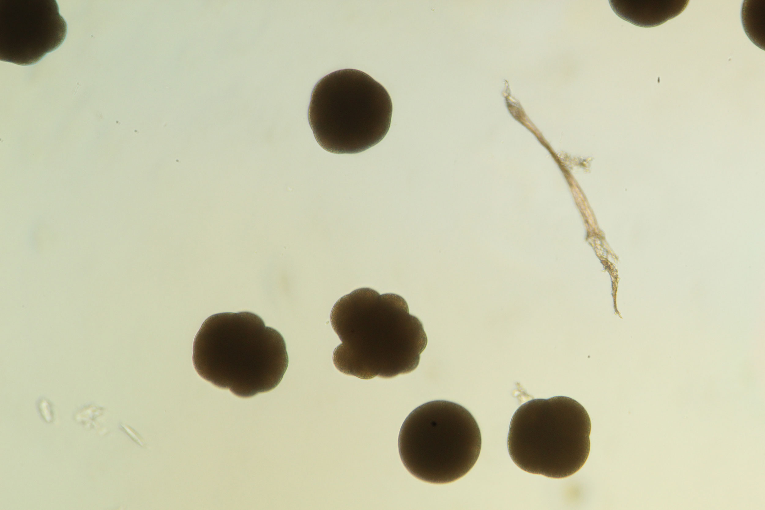 A few days later, the babies are visible to the naked eye—they look like flecks of gold dust or glitter slowly swirling around, or yeast right after it’s stirred into warm water but before it dissolves. Acevedo-Romo extracts a few into a petri dish. Under a microscope, their little yellowish bodies, about twice the width of a human hair, are covered in tiny hairs of their own that they use to swim. The hairs grow on one side first, she explains, so the larvae swim in circles until they grow more and learn to steer, swimming up higher and higher in the flask.