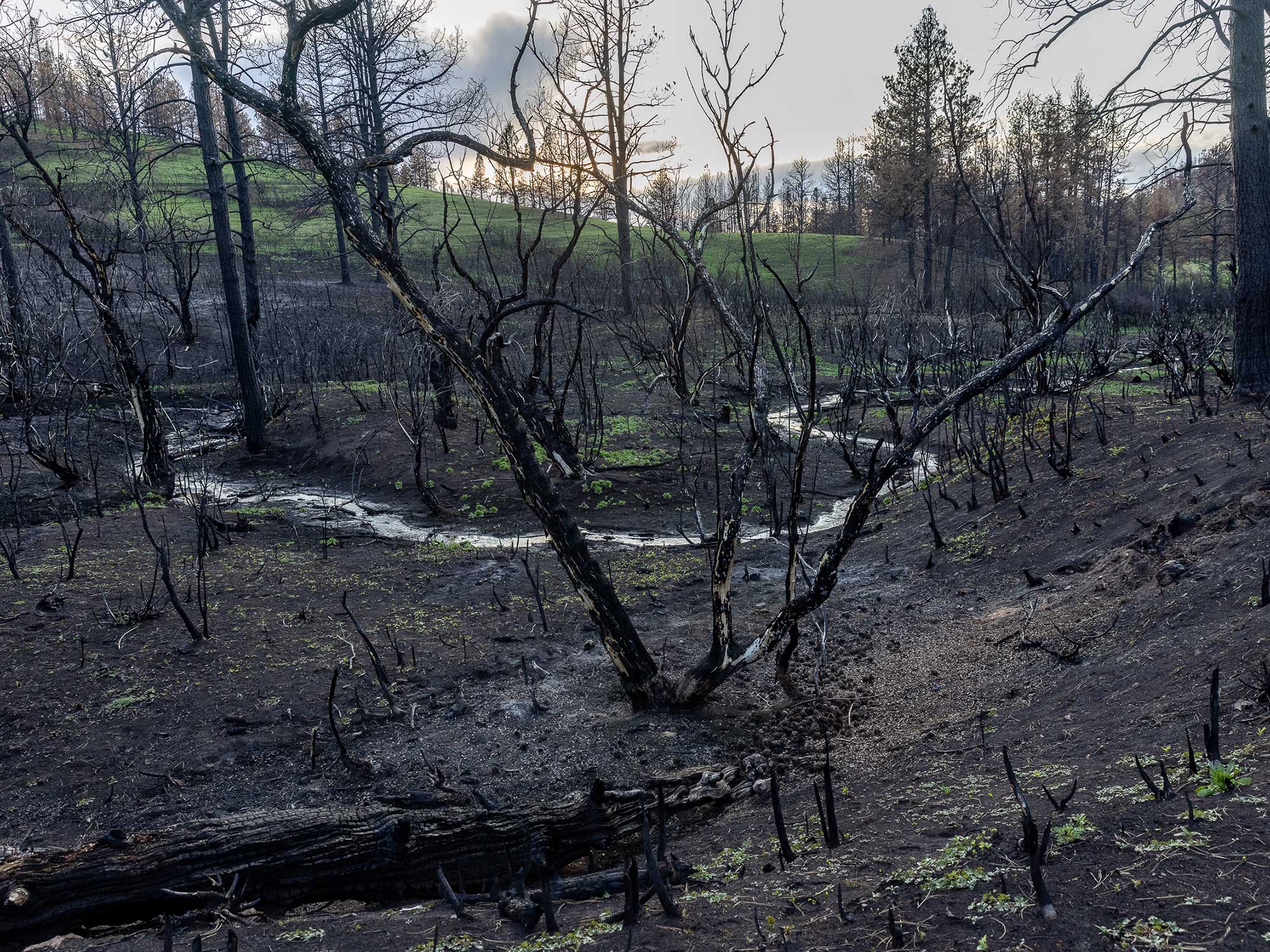 Peppers went home at 6 the next morning. The smoke was so thick, she drove the mile up her dirt road almost blind, navigating slowly, from reflector to reflector. At the cattle guard to a hayfield overlooking the hills, she opened the truck door, stumbled out and fell to her knees. Trees were charred into inky toothpicks, hay twisted together like matted hair across black dirt. And just half a mile away, all her horses were dead.