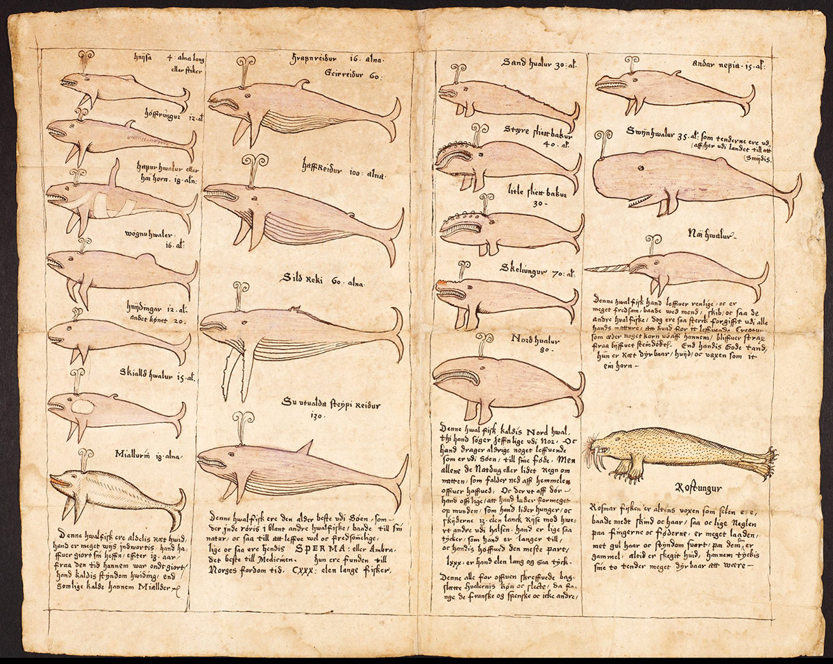 Szabo first became interested in Icelanders’ history with whales in the early 1990s. At first, she was limited to studying printed works like the Icelandic sagas, a collection of legendary tales recorded in the 13th and 14th centuries. The sagas and other texts—including those written by Jón Guðmundsson—are a trove of whale stories. “These people talked about whales all the time,” Szabo says. Often, they specifically mentioned blue whales.