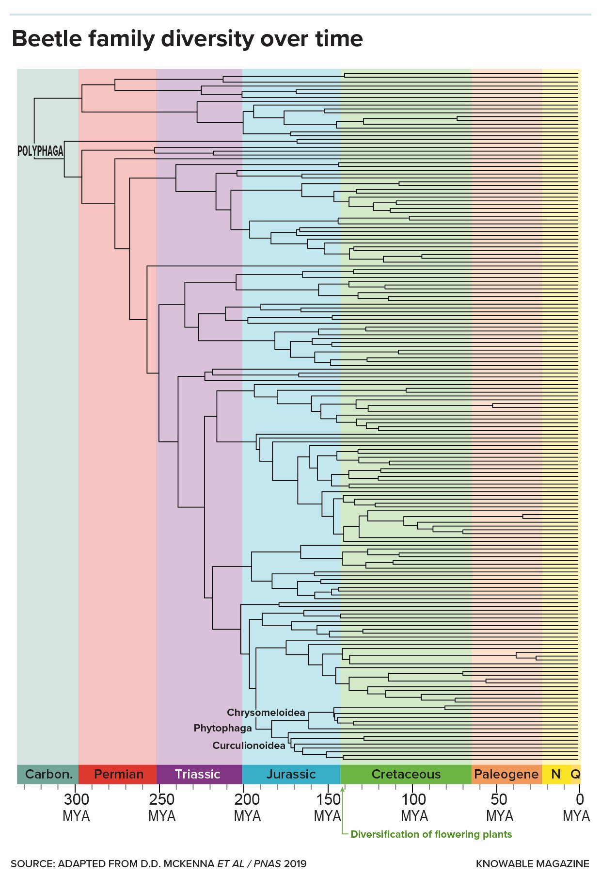 This large variation in species richness among beetle lineages means that “no one explanation holds very well for any one group,” says McKenna. Still, among plant-eating beetles—which make up roughly a quarter of all beetle species—a clear pattern is emerging. Based on genetic analyses of different beetle lineages, McKenna and his colleagues have found evidence that a major factor spurring beetle diversity was the diversification of flowering plants during the Cretaceous period.