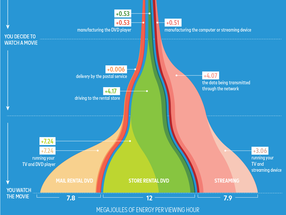 Nostalgic about browsing at Blockbuster? Don’t be. Of all the ways to view a film at home, driving to a store to rent a copy consumes by far the most energy. It’s not exactly a Shyamalan twist to learn that gas-guzzling vehicles are bad for the environment. But what if we told you that streaming uses as much juice as getting a flick in the mail, old-school Netflix-style? An hour of streaming equals just over a week of light from a 10-watt LED bulb.