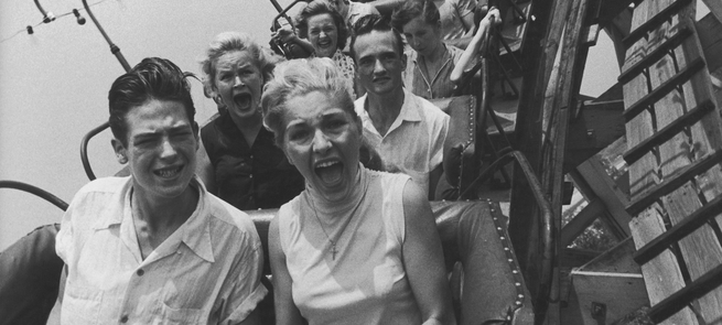 It wasn’t until well into the 20th century that photographers began focusing on the wild expressions of the patrons. Cameras were smaller by then and photographers working for newspapers or the amusement park’s publicity department could now bring gear along for the ride and shoot during the journey. Photos from the ‘40s and into the early ‘80s capture riders with a wide angle lens and from a perspective of just in front of the thrill seekers.