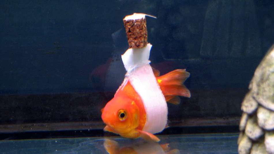 Cork isn’t the only way to repair a goldfish. Here’s video of a goldfish in what appears to be a sling made from straws and pipe cleaners: