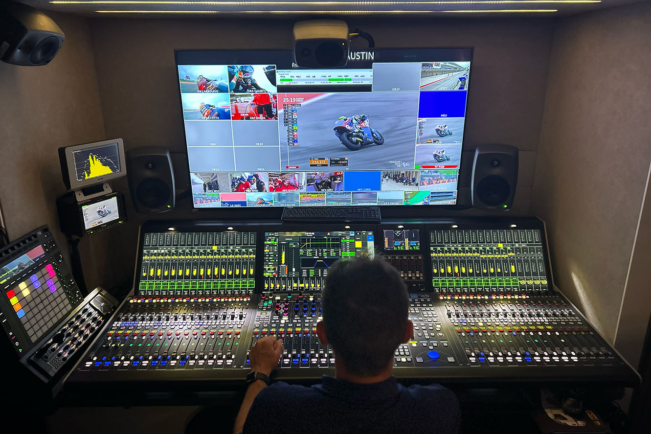 Along with the track audio, de-embedded from the video feed in the audio control room’s Lawo mc256 console, Dorna’s engineers mix in wireless feeds from custom bike-mounted heat-tolerant Audio-Technica BP899 low-profile lavalier omnidirectional condenser microphones, as well as discreet wall- and ceiling-mounted U851R unipoint cardioid condenser boundary microphones in the pit boxes. Audio-Technica even provides the mics, in-ear monitors, and headphones for race control and ENG (electronic news gathering) teams. Altogether, upwards of 300 audio channels combine to round out the activity for home viewers saturated in even more rumble and roar than they could be from the stands.