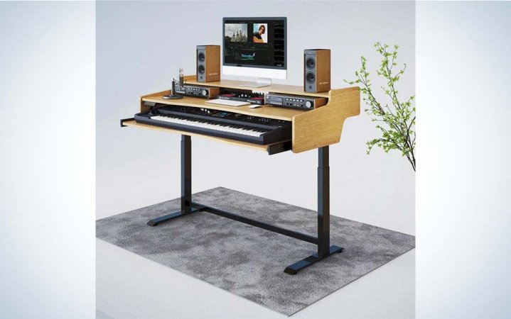 Why it made the cut: With a tray for an 88 keyboard, space for an equalizer, amp, speakers, and two monitors, this versatile desk is perfect for musicians and podcasters alike.