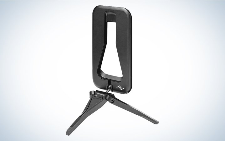 The ultra-compact Peak Design tripod is about the size of a stack of credit cards when folded down—making it a great choice for the iPhone shooter looking for a pocket-sized tool. It’s made of machined and anodized aluminum and features grippy feet to dampen vibrations when in use. It uses magnets to attach to your iPhone, which makes it easy to switch between landscape and portrait mode—but you will need a Peak Design case or a MagSafe case to use it. It comes with an embedded tool for adjusting ball head tension and a pouch for storage.
