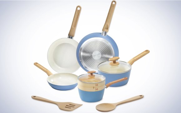 GoodCook’s 10-Piece Healthy Ceramic Titanium-Infused Cookware Set offers a tremendous value given its sub-$100 price. The set includes two pans, two saucepans, a steamer, an egg pan, a wooden spoon, a slotted turner, and a variety of lids. The cookware comes in fun colors, with glass lids that allow you to watch your food as it cooks. GoodCook says the aluminum body beneath the ceramic surface of each pan promotes even cooking, while the wood grain handles are comfortable to hold. You may find yourself wanting a larger frying pan and pot when cooking for a crowd, but this set contains everything you’ll need to cook for a couple of people on a regular basis.