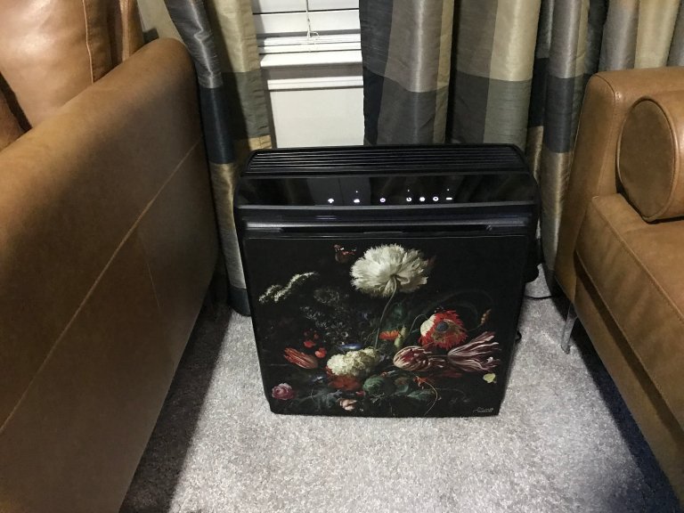We also like the ability to choose from one of four custom filters: germ defense, pet allergy, toxin absorber, and odor remover. The medium, activated charcoal, BioGS HEPA, and customized filters are included in the filter kit, and the other customized filters are sold separately. In addition, the front panels can be swapped out. The default is either a black or white panel. However, as you can see in the photo above, I also opted to get one of the A3 Artists Series front panels (Vase of Flowers), available on the Rabbit website.