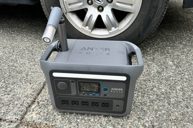 Stepping up to a larger but still portable size is the Anker SOLIX C800 Plus, which features the coolest lighting feature I’ve encountered. While it’s fairly common for power banks to have lighting of some kind, the C800 Plus boasts a telescoping lamp, the pieces of which connect magnetically. So not only is it a substantial power source with plenty of outlet options, but it has this easy-to-set-up and tear-down camp light integrated into it. It recharges from a wall socket fast, or via solar panels or a car port more slowly. It has the capacity to recharge an ebike roughly once, which is why I always pack it along when I’m hitting the trails.