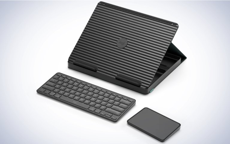 We were skeptical about this tool, but it’s earned a permanent spot in our backpack when going on work trips. The stand elevates the laptop enough that using a computer in a hotel room for an extended period doesn’t lead to neck pain. The keyboard’s keys have enough compression that our fingers don’t hurt after typing on them, and the trackpad works remarkably well on macOS. Additional design features, including a closed compartment inside for holding chargers or cables and a flexible strap that keeps the system securely closed while traveling, are icing on the cake.