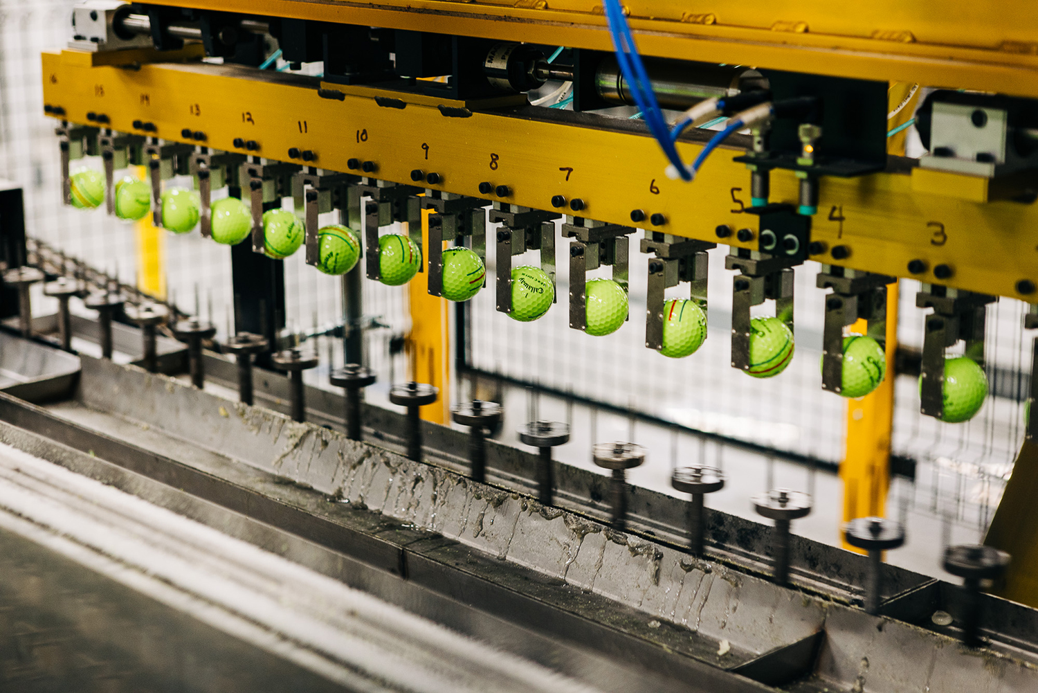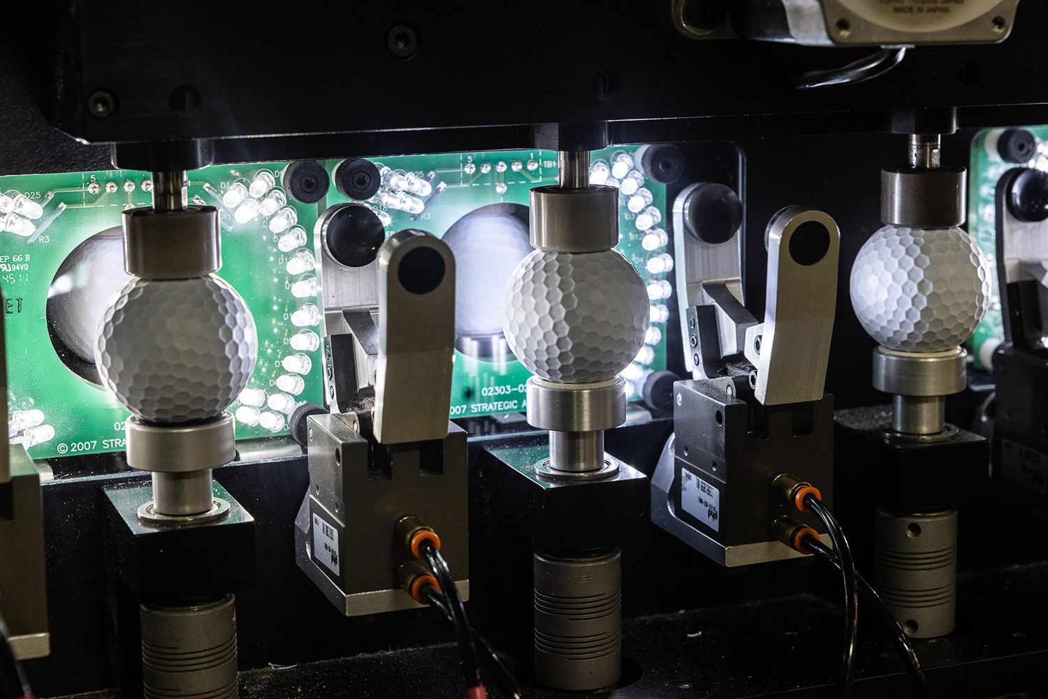 ↑ The balls go through another injection molding process to get a golf ball’s signature dimpled urethane cover. After this step, Callaway employs a secretive three-dimensional X-ray process to inspect the inside of every ball without cutting it open. This ensures the center of gravity exists in its actual center; if it’s off even a little bit, odd or unpredictable flight paths will result.