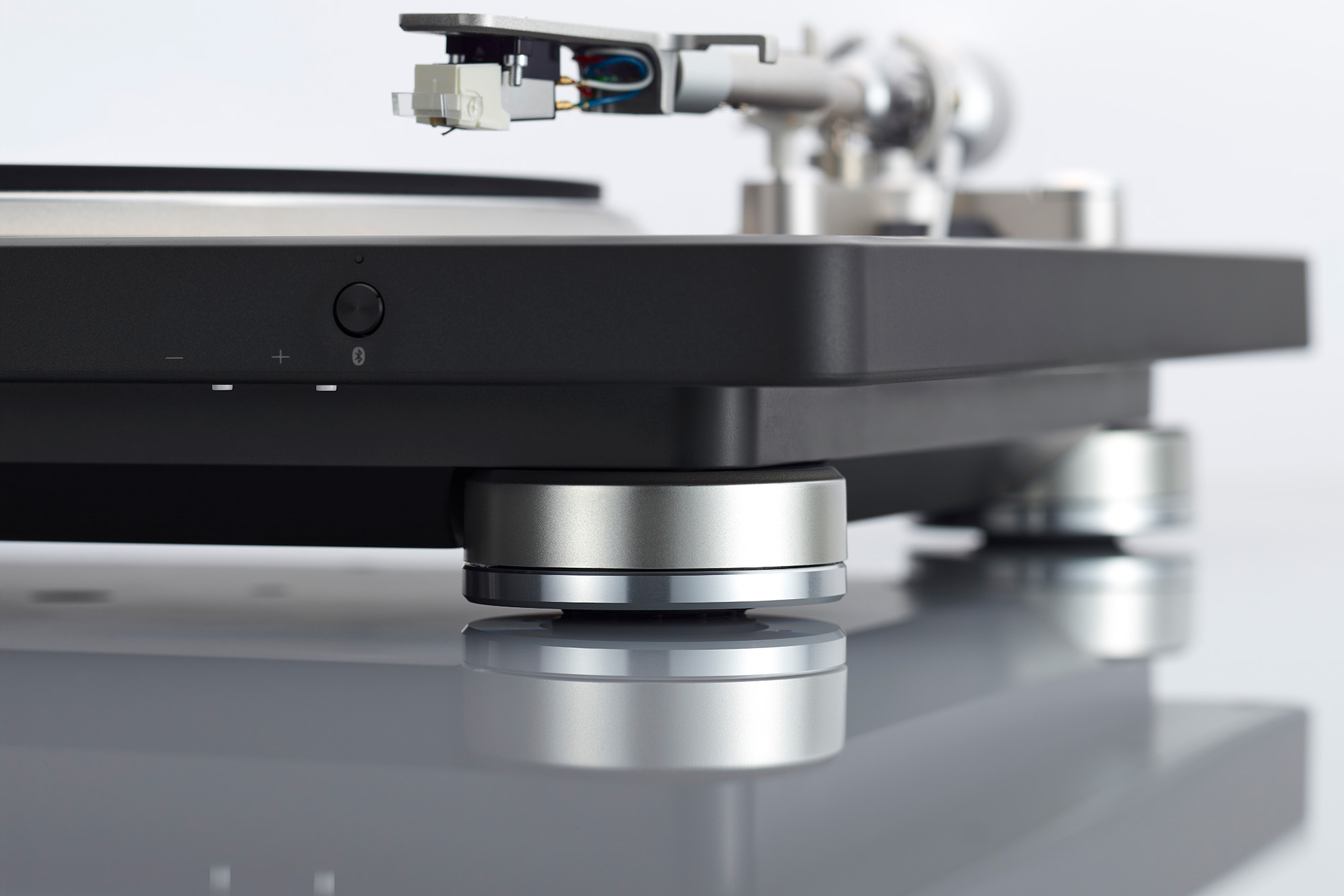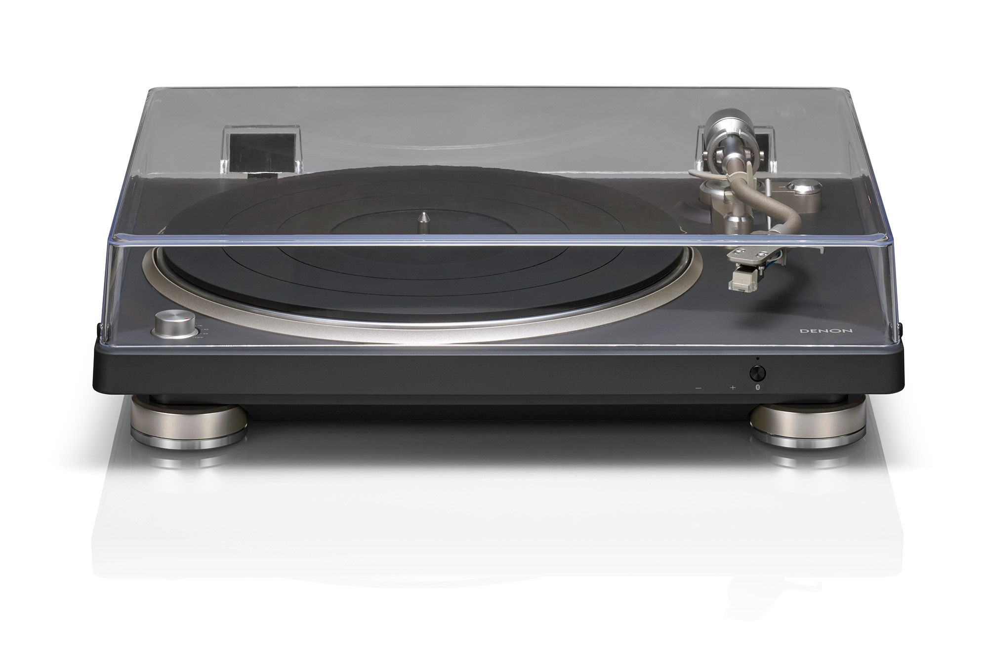 Then there’s the other half of the sell. Sure, the DP-500BT can drop into a conventional system over RCA [We heard a preview with it plugged into a 100W Denon Home Amp powering Polk bookshelf speakers, shown at top]. But with the touch of a button on the front, it can also connect wirelessly to send vinyl over Bluetooth via SBC, aptX, aptX HD, and aptX Adaptive for less compromise, with volume buttons discreetly tucked under the chassis. That gives it a wider orbit than most hi-fi-minded decks. It works for someone with a proper two-channel setup, and is also convenient for the listener starting with a stack of LPs and a single wireless speaker (maybe from the HEOS-powered Denon Home line), then growing into something fuller later. Or maybe you want a late-night listen without disturbing the rest of the household; just connect to some wireless headphones, such as the flagship Bowers & Wilkins Px8. Denon has spent more than a century talking about detail and sound-master tuning; this feels like one of the cleaner expressions of that pitch. One-box simplicity, two trajectories.