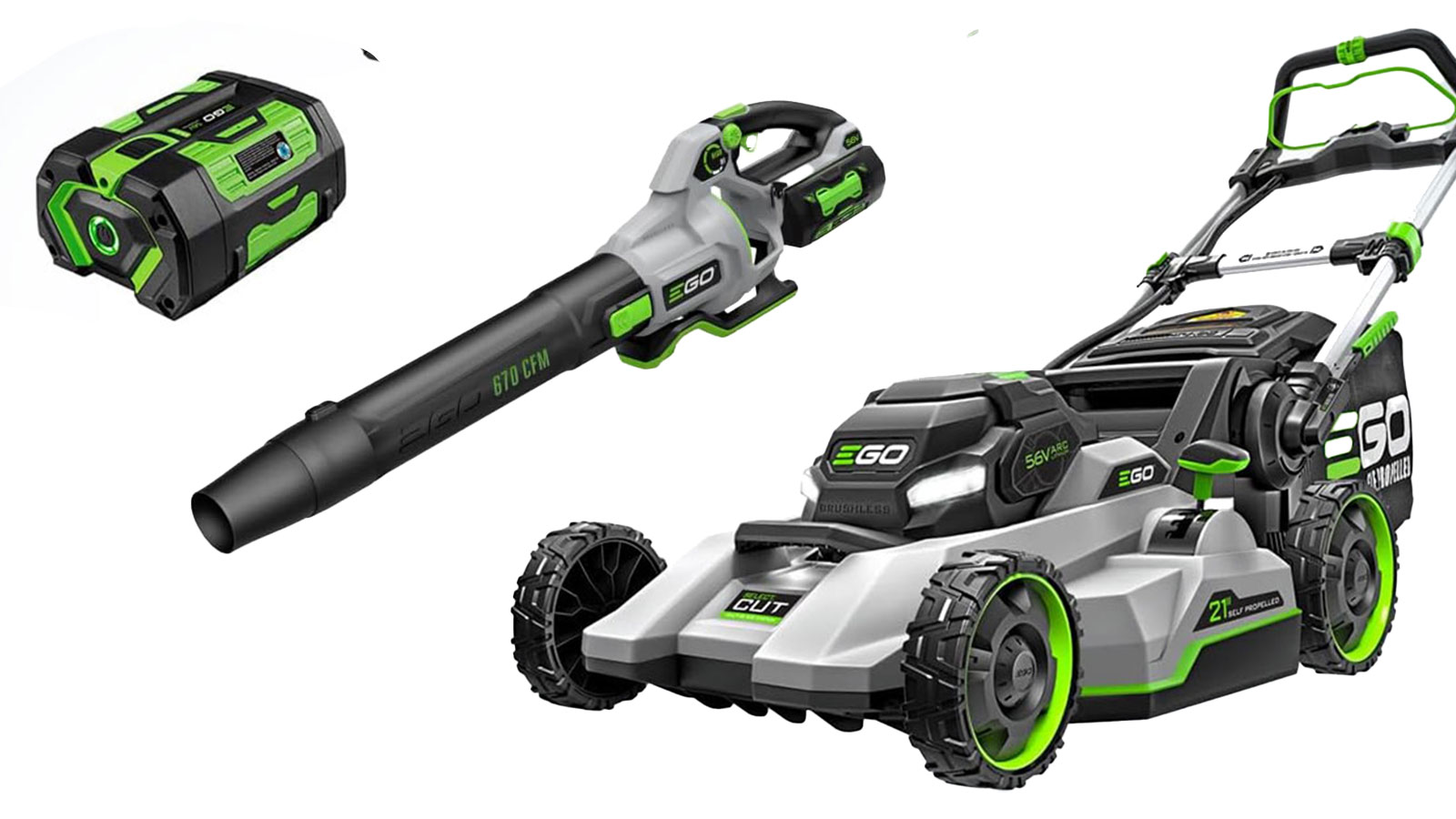 - EGO Power+ LM2102SP-A 21-Inch 56-Volt Lithium-ion Self-Propelled Cordless Lawn Mower, (2) 4.0Ah Battery and Rapid Charger Included $489 (was $649)