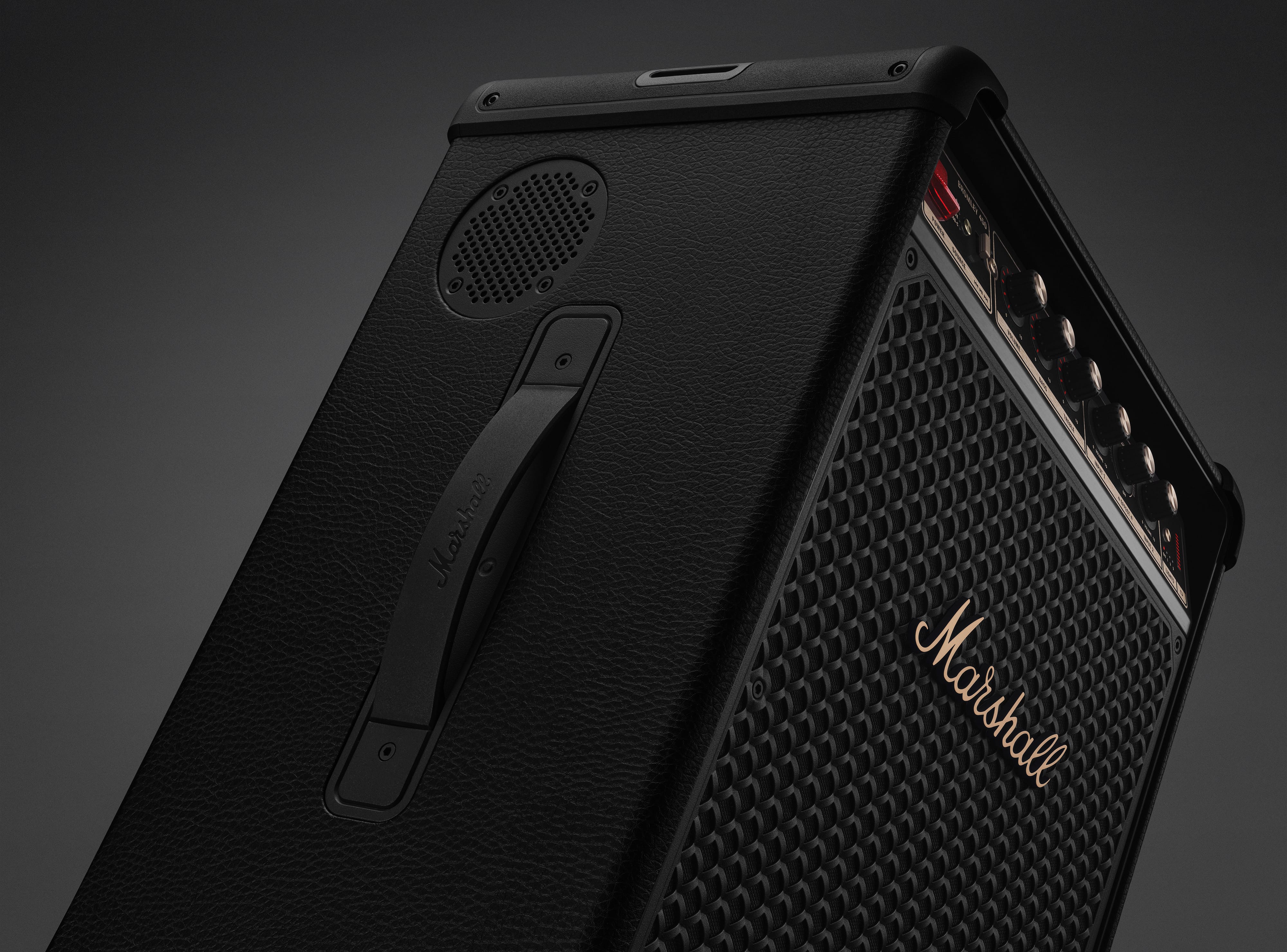 The 450 keeps pro-leaning bits intact, building around a six-driver array featuring dual 6.5-inch woofers, four 2-inch full-range drivers, and a pair of 8-inch passive radiators, all wrapped in a water-based PU leather wrapped enclosure with TPU corner caps and fed by Class D amplification. And the 42Hz – 20kHz response is tuned for what Marshall values most: fast, punchy bass, clean mids, and crisp, energetic highs presented in 360-degree “True Stereophonic” sound. This makes it less a speaker beaming beats at part of a room and more a speaker filling an entire room with rhythm. And tactile bass/treble knobs, plus separate input levels and effect controls, let you treat it less like a generic Bluetooth block and more like a compact party PA.