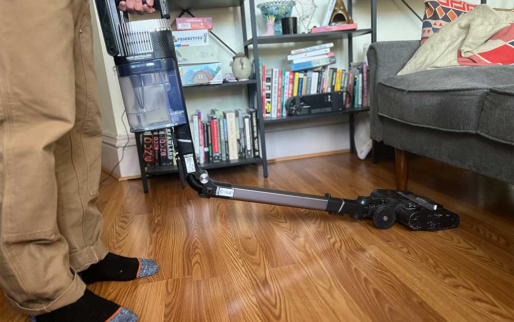 My favorite feature on the Shark Stratos cordless vacuum is the MultiFLEX wand, which allows you to bend the wand to clean under furniture (as you can see above), or fold it over itself for compact storage. I’m not the only one who loves this vacuum: It’s currently sold out at Amazon and about to sell out at Walmart. However, you can still find it on Shark’s website at its best price. This Shark vacuum has ultra-powerful suction to leave your floors debris-free. Clean IQ tech uses an infrared sensor to detect dirt and auto-boosts power for better pickup. It has some of the best suction among Shark vacs thanks to HyperVelocityPlus. A two-brush roll system gets deep into the carpet and also leaves no crumbs on hard floors. Plus, the brush roll is self-cleaning. I have a cat, so all of these features are important to keeping my home fur tumbleweed-free and containing any litter that gets out of the box.