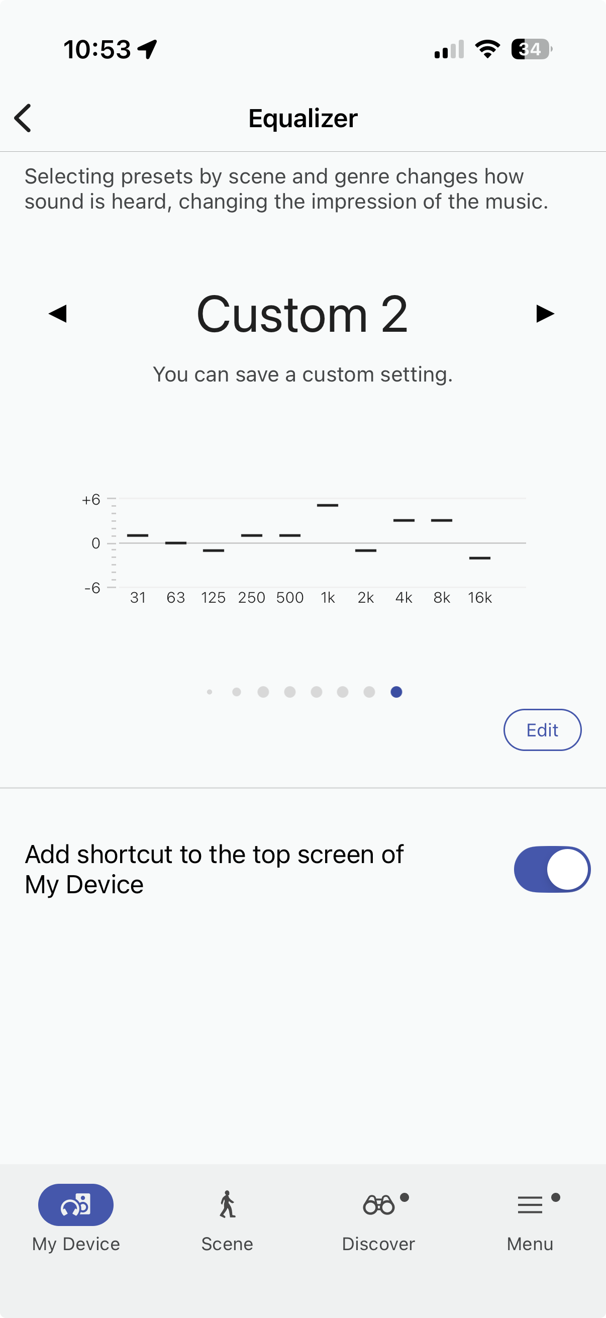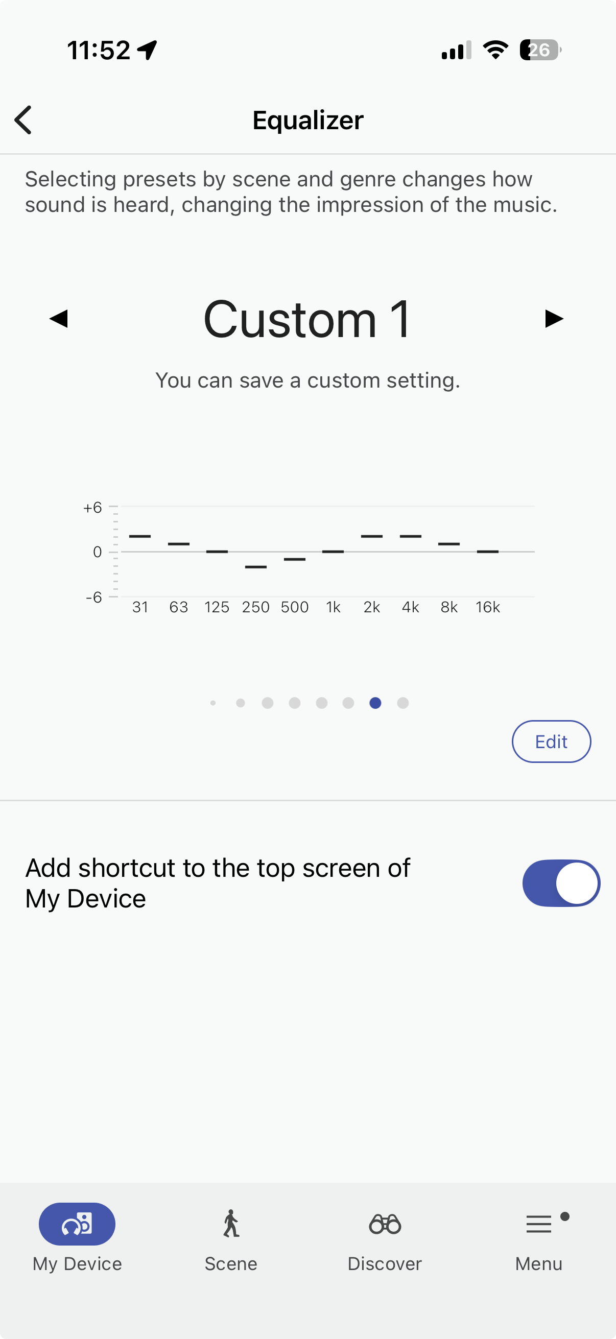 Like things more incisive? You’re in luck. The WF-1000XM6 now supports a 10-band (±6dB) EQ through the Sony Sound Connect app, so you can sculpt curves that suit your preferred vibe(s) and genre(s). That’s two to three times the bands that most of Sony’s direct competitors let you tweak. Personally, I found EQ really gave the WF-1000XM6 life, so I’ve shared two custom presets below. I really like the tight but not boxy Custom 1 with metal tracks, and the more mids-forward/sparkly Custom 2 with indie/pop—basically anything that needs more vocal intelligibility. YMMV. (Adaptive and Scene-Based Listening, as well as 360 Reality Audio, are modes we still need to explore following a firmware update.)