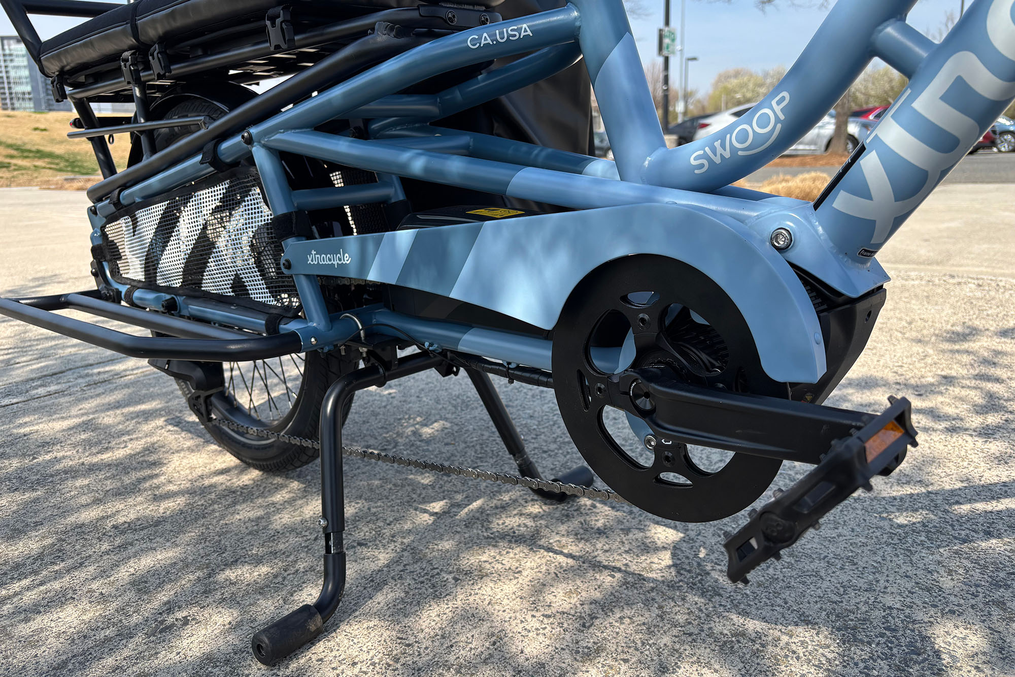 It’s also a better value than it first appears. The included accessories—especially the front rack, which quickly became a favorite—along with footrests and wheel guards to keep little feet out of spokes, cover a lot of what families typically end up buying anyway. Outfitting another cargo bike like this can easily add a few hundred dollars, so it’s nice not to start from zero. Like most cargo bikes, the Xtracycle Swoop ASM is big with a 54-inch wheelbase. It can fit through a standard doorway, but tight turns and small indoor spaces are a challenge, and locking it up at crowded bike racks can be awkward. It’s best suited for someone with a garage or generous storage space. Apartment living isn’t impossible, but it’s more challenging than a typical commuter or folding ebike, so ground-floor access or a roomy elevator will make a big difference.