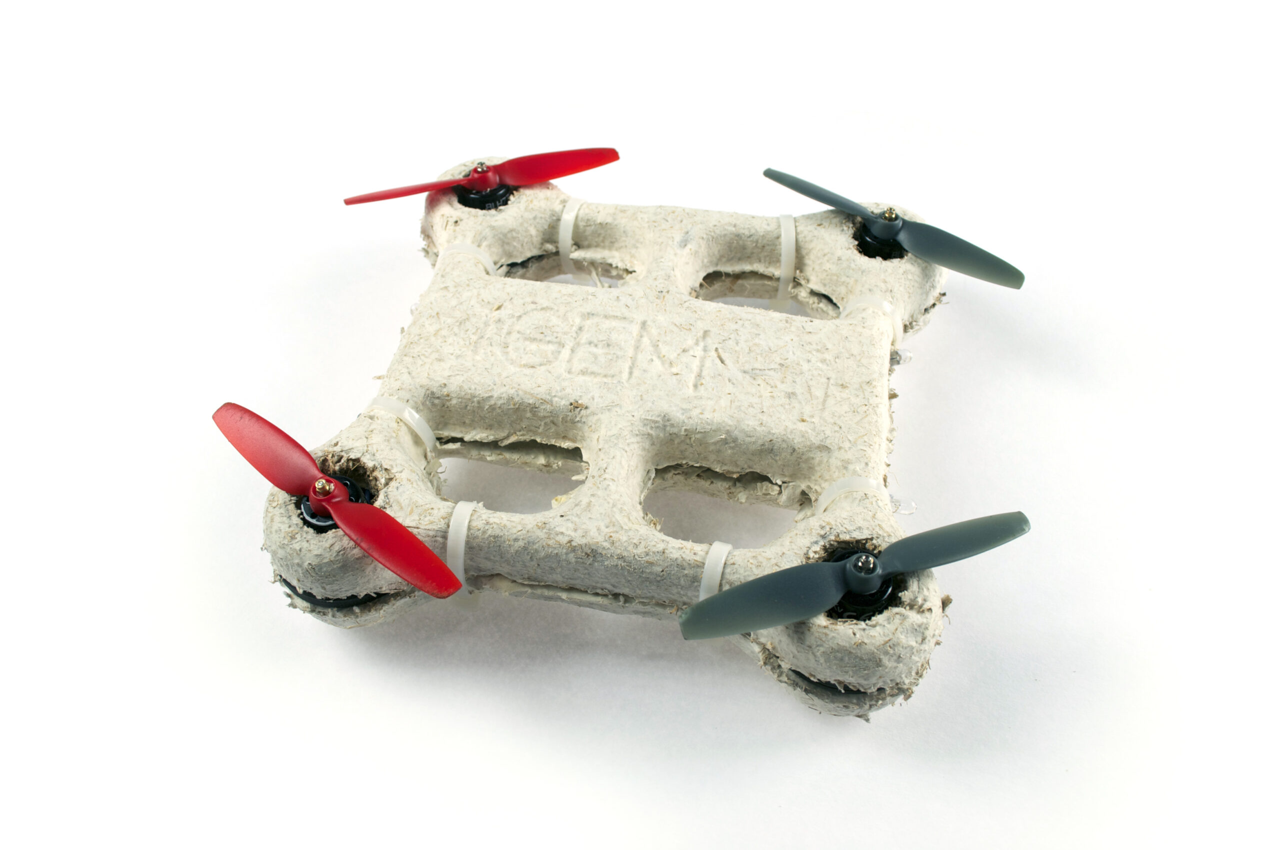 To start, the iGEM team designed the drone’s shape in 3D modeling software. This design file was sent to biomaterials company Ecovative Design, which fabricated the drone body from an 8-inch square of fungal mycelium via vacuforming. Then Ecovative filled this mold with biomaterial: straw and dead leaves. “The biomaterial gets inoculated with fungus, then fungus grows throughout all the material in the mold,” explains Eli Block, a member of the iGEM team and a junior in a dual-degree program at Brown University and the Rhode Island School of Design. “Before where it was kind of a loose material, after growing for a few weeks, it was a single solid chunk.” Two of these molds, each about 8 inches across and skinned in bacterial cellulose acetate, formed the drone chassis. “So it looks like a dried sandwich, and it’s the weight and feel of Styrofoam,” Rothschild says.