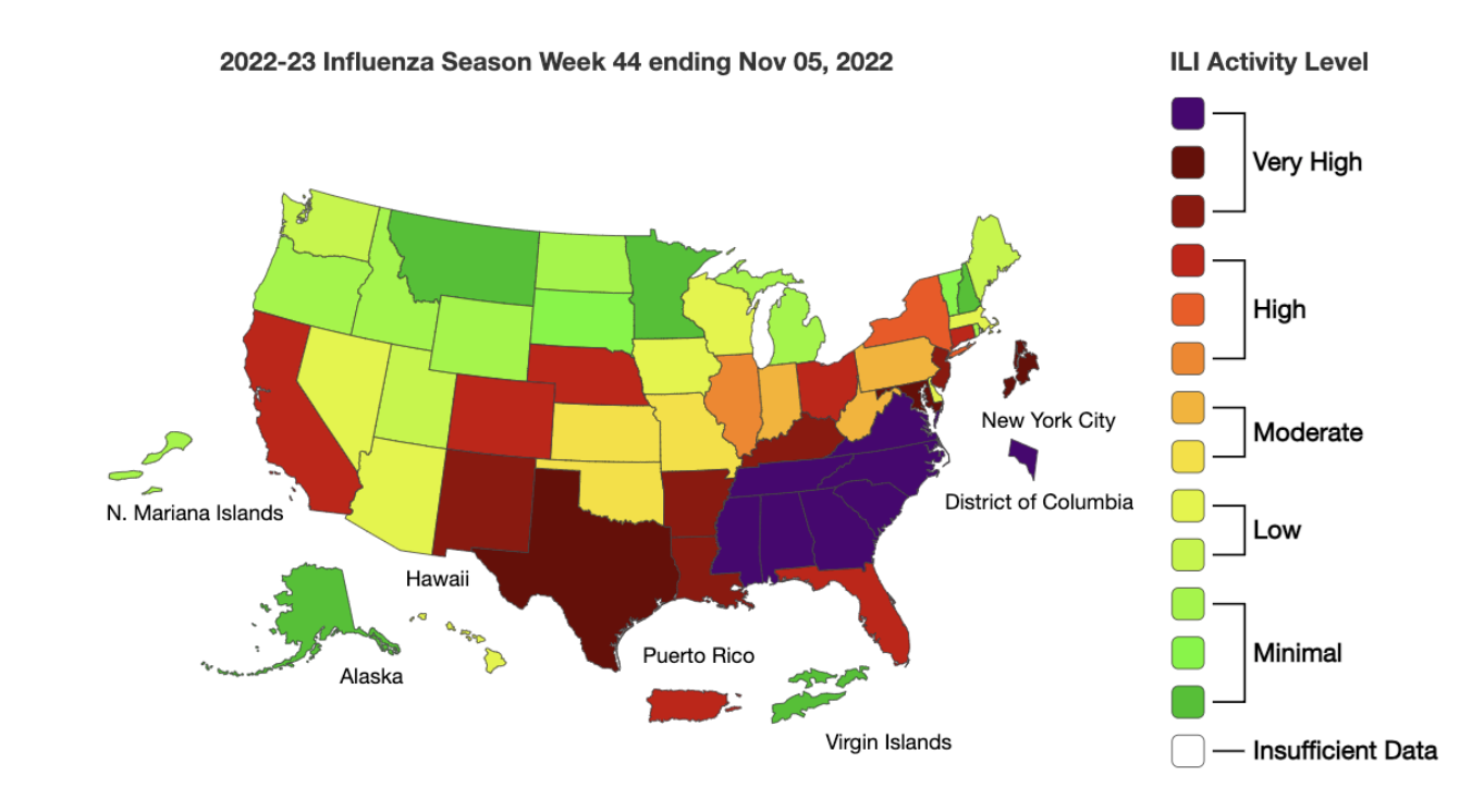 As predicted by experts earlier this fall, the 2022-2023 flu season is shaping up to be one for the record books. According to the Centers for Disease Control and Prevention (CDC), Alabama, Georgia, Mississippi, North Carolina, Tennessee, South Carolina, Virginia, and Washington DC are categorized in purple as “very high” for flu activity about one month ahead of schedule. Five more states (Arkansas, Kentucky, Louisiana, New Jersey, and New Mexico) are close behind in the maroon “very high” category.