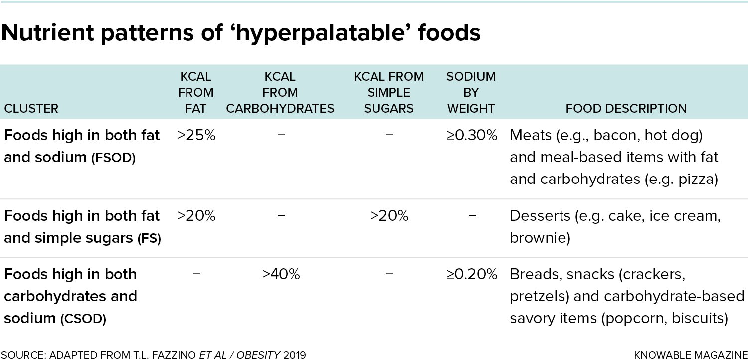 Hall and colleagues also saw in the study that participants ate more when they were offered foods containing greater amounts of certain pairs of nutrients — fat and sugar, fat and sodium, or carbohydrates and sodium — than are found in nature, or in whole foods. Such foods are “hyperpalatable,” explains Tera Fazzino, a behavioral psychologist at the University of Kansas who defined the term. Hyperpalatable foods have been shown in animal and human studies to excessively activate reward-sensing circuits in the brain, and it’s more difficult to stop eating them, she says.