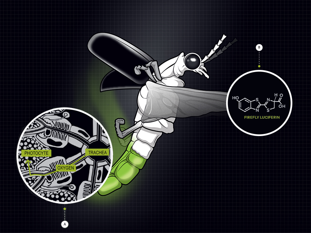 Step 3: Inside the photocytes, the luciferase enzyme merges with the light-producing luciferin molecule (B), catalyzed by oxygen and energy-storing ATP. The result: oxyluciferin, a compound with excess energy in its atoms that is released as light. It’s visible through transparent segments of the bug’s lower abdomen.