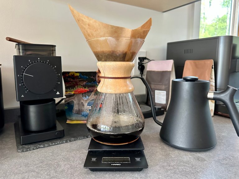 To me, a Chemex is the simplest pour-over device. Its clear glass body can brew several cups at once, and makes it easy to see how much water you’ve poured. It’s easy to clean, too. Toss the filter in the trash—or wash out a metal one—and rinse it under the faucet.