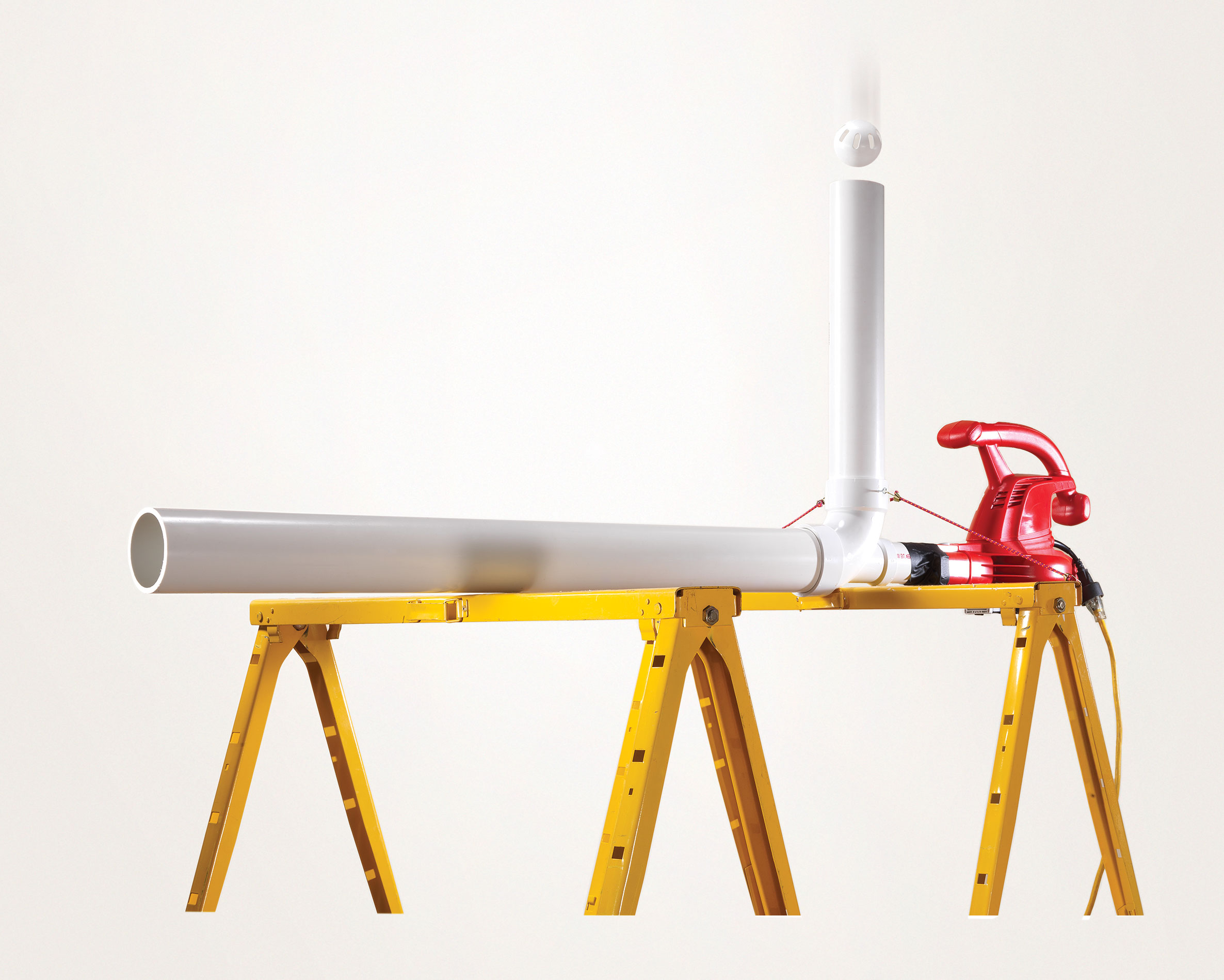 The project hinges on a key component: a PVC plastic fitting called a “low-heel inlet elbow,” available at most hardware stores. Although it’s typically used to vent bathroom plumbing, by a miraculous quirk of fate, the elbow happens to be the ideal tool to transform a leaf blower into a Wiffle ball pitcher.