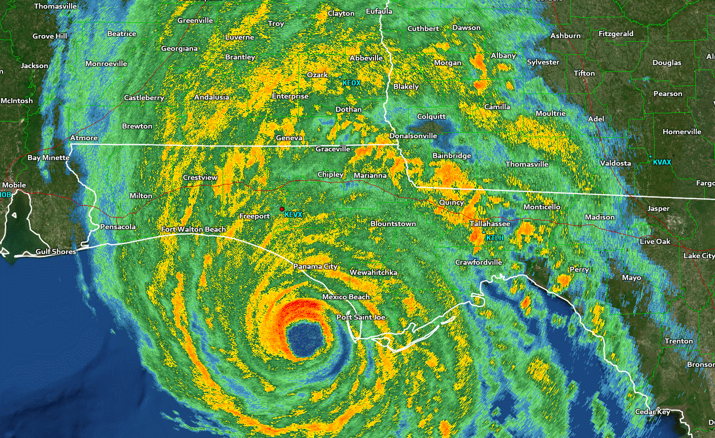 Hurricane Hunter aircraft continued to fly through Michael all the way until it made landfall around 1:30 p.m. EDT on Wednesday. The hurricane peaked with maximum sustained winds of 155 MPH and a minimum central pressure of 919 mb as it crossed the coast just southeast of Panama City, Florida. The weather station at Tyndall Air Force Base recorded a wind gust of 129 MPH before the calm eye of the storm moved overhead. Storm surge flooding of more than seven feet above ground level was recorded in Apalachicola, a town several dozen miles from the point of landfall but located along a part of the coast that’s extremely susceptible to storm surge.