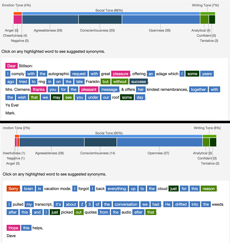 The results were surprisingly close (and I know my writing skills are objectively nowhere close to Twain’s). The Tone Analyzer breaks writing down into three tones: emotional tone, social tone, and writing tone. Within those categories, Twain scored 4 percent emotional, 88 percent social and 7 percent writing. I went 2 percent emotional, 90 percent social and 6 percent writing. (The unaccounted percentage points seem to be proper nouns and other words the computer couldn’t understand.) It also picked other notes out of our writing, like words it deemed cheerful. Twain had 4 cheerful words (dear, pleasure, thanks and pleasant), and I had only 1 (hope).