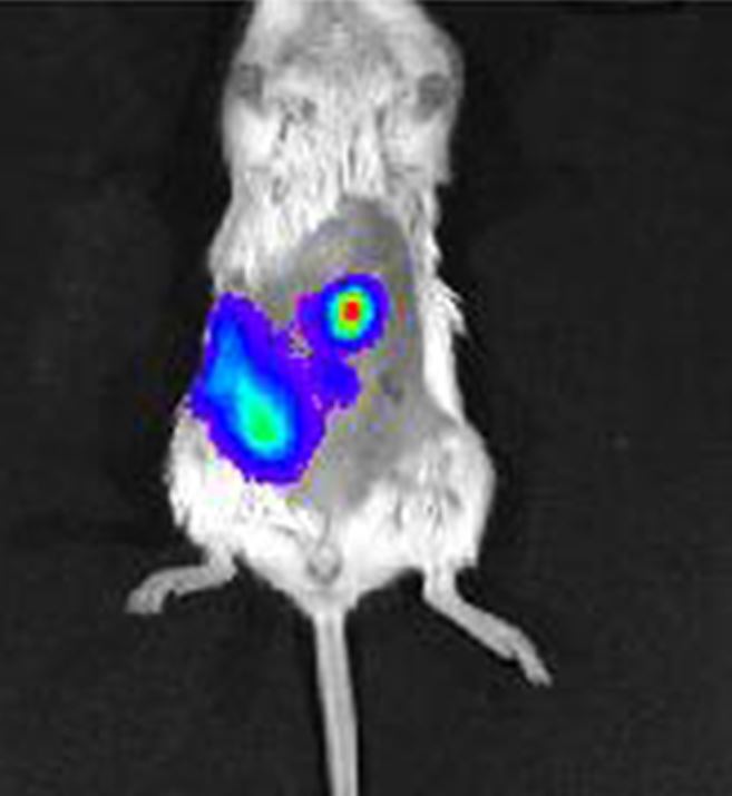 They chose a technique known as in vivo molecular imaging. In a process similar to magnetic resonance imaging (MRI), a living organism such as a human, or in this study’s case, a mouse, is placed into a chamber and is exposed to a variety of invisible rays. But unlike an MRI, which uses magnetic fields and radio waves, this form of imaging uses no emissions. Instead, it only detects molecules with the capability of emitting natural light, a phenomenon known as luminescence. The result is a dark outline of the individual with bright spots visible on the inside.