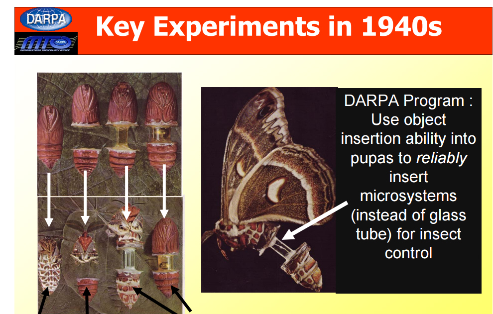 It’s a slide with this illustration that DARPA tantalizingly titled “Key Experiments In The 1940s.” DARPA didn’t come into existence until 1958, so the bisected moth experiment can’t be the experiment from the 1940s that’s alluded to by the title. Finding those specific documents will likely be trickier. The 1940s were not a calm decade, and after the war, a massive reorganization of America’s entire military structure likely let a few documents get lost in the shuffle. But if DARPA knows enough to allude to experiments in the 1940s, then some evidence must exist.