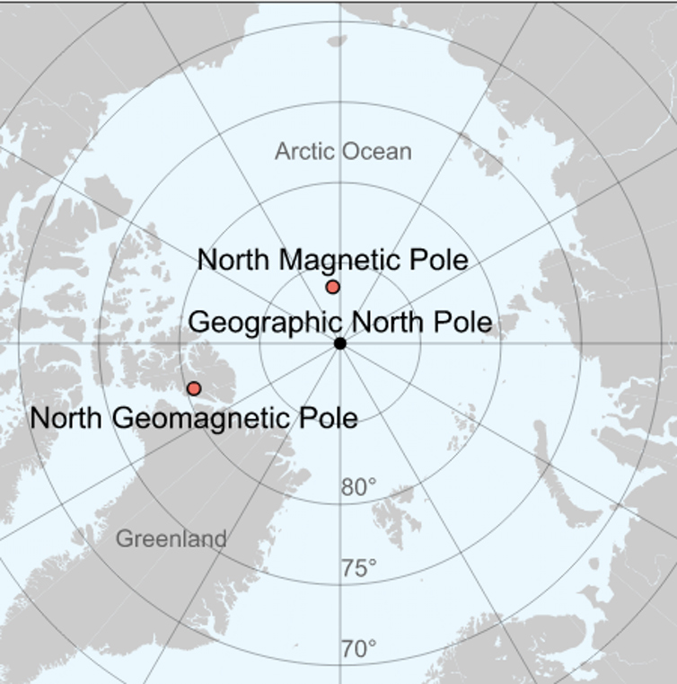The magnetic poles are the points on the Earth’s surface where a compass needle points downwards or upwards, vertically. They aren’t necessarily connected and drawing a line between these points, through the Earth, would not necessarily cross its centre. Therefore, to make better models over time, scientists assume that the Earth is like a bar magnet at its centre, creating poles that are exactly opposite each other—”antipodal.” This means that if we drew a line between these points, the line would cross directly through the Earth’s center. At the points where that line crosses the Earth’s surface, we have the geomagnetic poles.