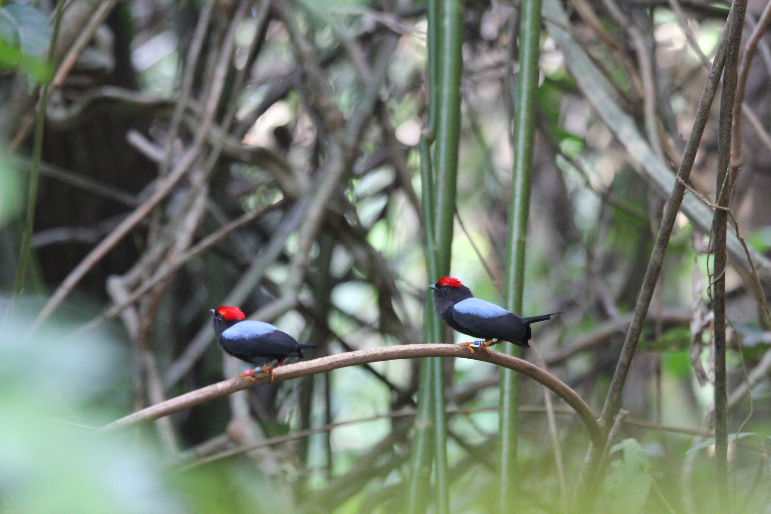 Groups of up to 30 white-bearded manakins have been known to congregate in a space about the size of a conference room, DuVal says. “They’re just a few feet apart from each other and they’re making these loud snapping, jumping displays and when a female comes into that area they all just go nuts at the same time.”