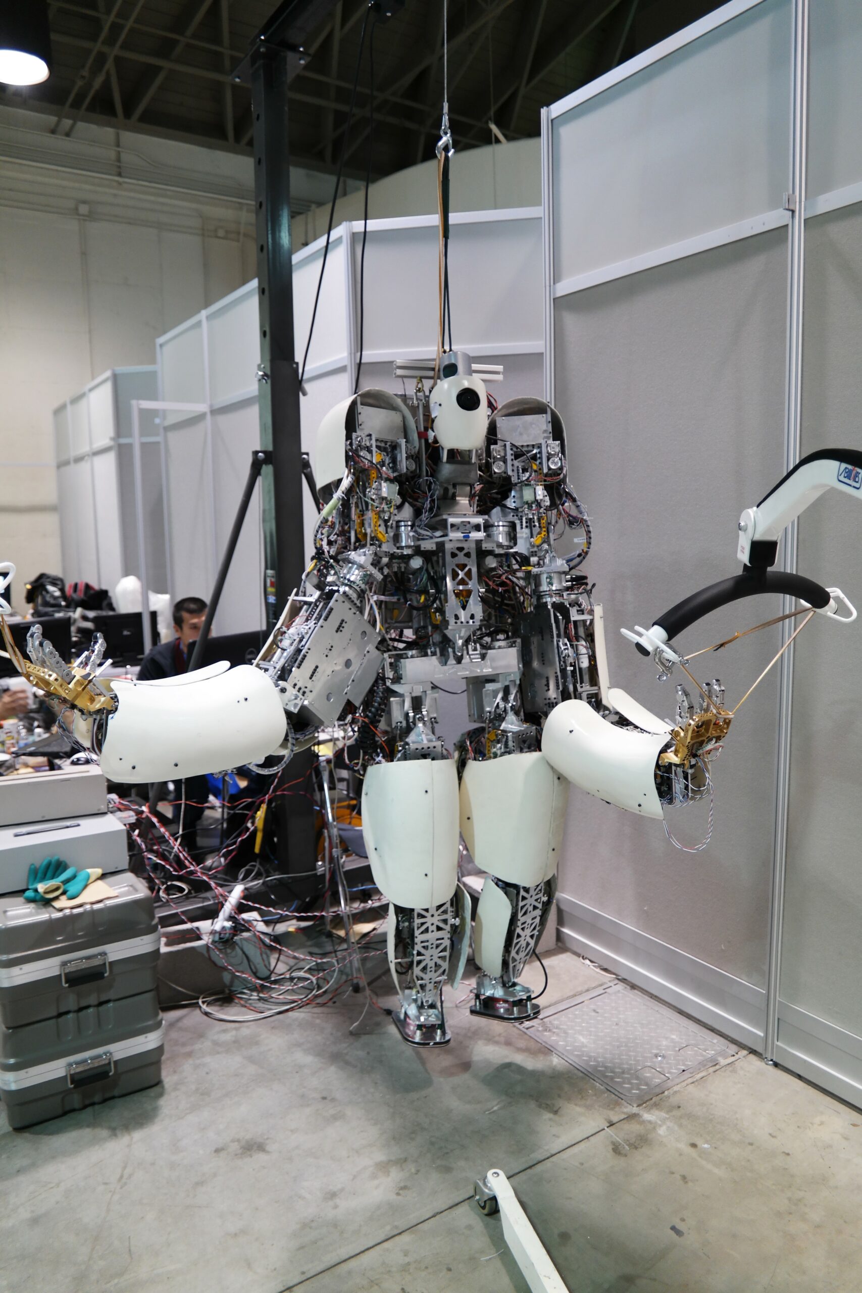 Unfortunately, Hydra ran behind schedule, and wasn’t even ready to be properly demonstrated at the DRC Finals this year. Team NEDO-Hydra tried to field a smaller backup robot, but technical difficulties forced them to cancel their run. So they rolled Hydra out to the front of their space in the team garage, in the hopes that someone might come across their work in progress.