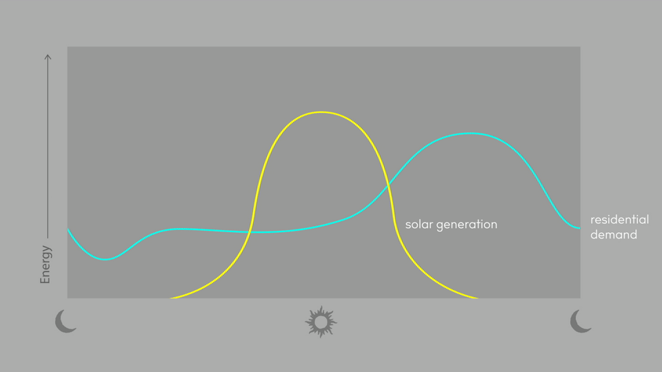 There are two ways to fix this graph. One is to extend supply, storing surplus energy generated during day until it is needed at night. Scientists and engineers have made huge breakthroughs in battery storage. However, home batteries remain costly, and even a very large battery can only power a home for a few hours.