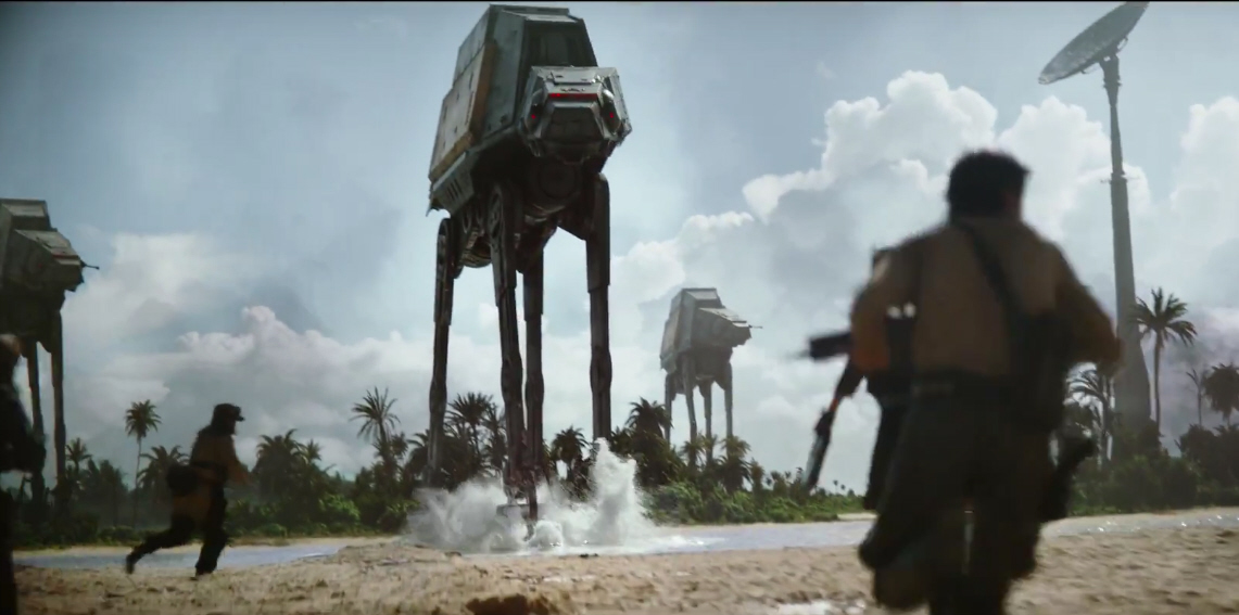 It isn’t all giant doomsday weapons, hotshot pilots, and space planes. The Rogue One trailer features some exciting combat on the ground, with some smaller but still-deadly weapons. Fan favorite AT-AT walkers, first seen in The Empire Strikes Back slogging through the ice of Hoth, here terrorize a tropical beach like it’s Iwo Jima.