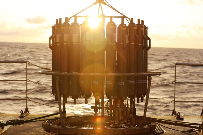Five teams stare nervously at the water’s surface while the rosette climbs ever so slowly back up from the deep. This piece of oceanographic equipment is loaded down with tall grey bottles of water samples and five experimental pH meters strapped tightly to its frame. Quite literally millions of dollars are at stake, and the teams, who’ve been working for a year on their entries in the Wendy Schmidt Ocean XPrize, are anxious to see whether they’ve survived the trip down 10,000 feet into the deep, dark ocean.